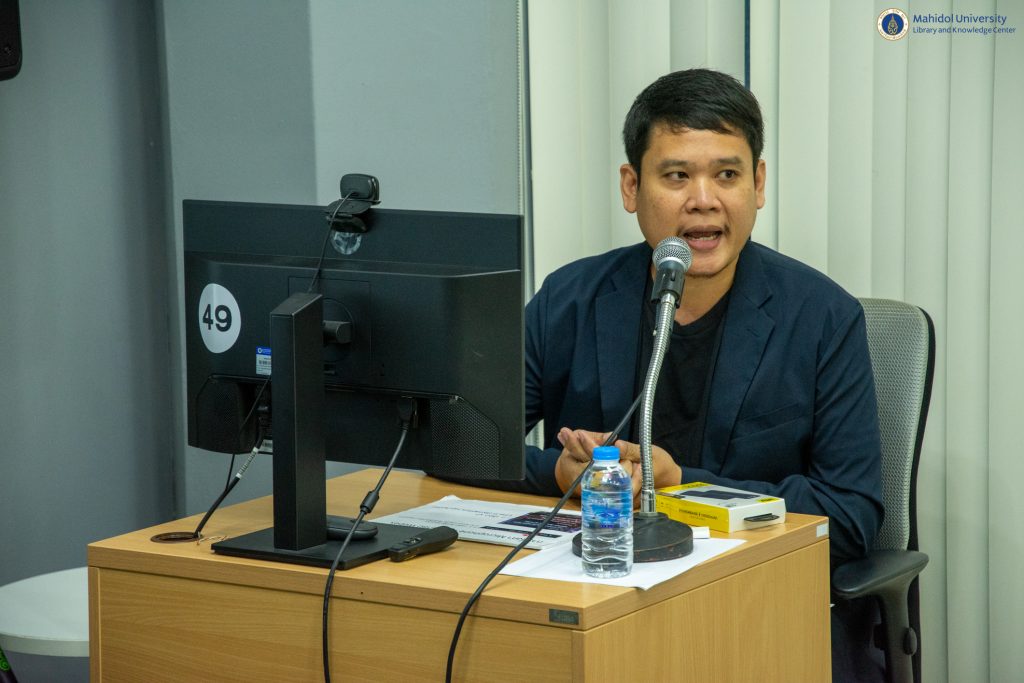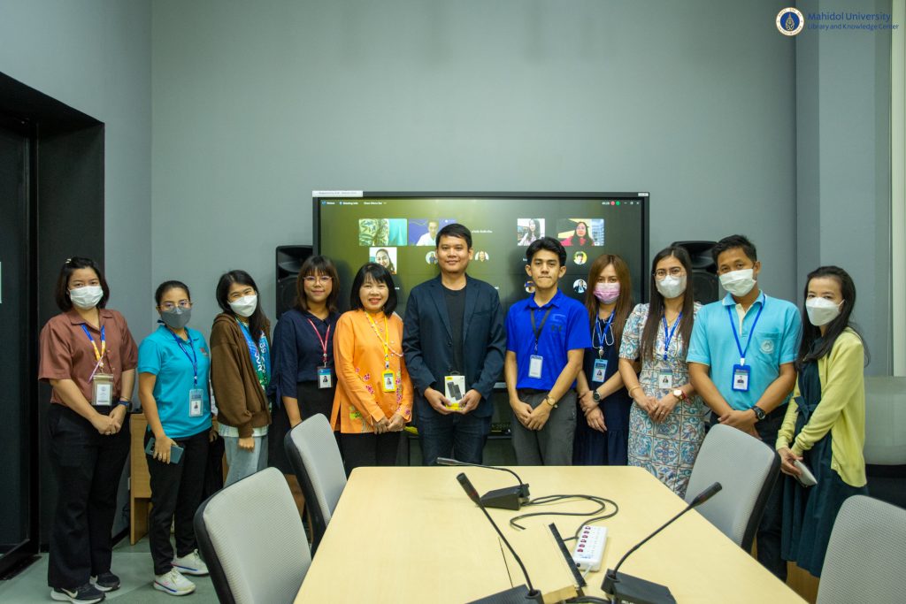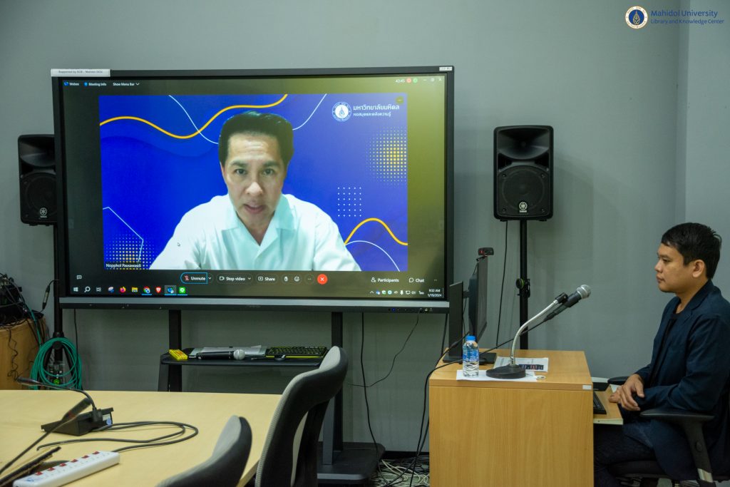 หอสมุดและคลังความรู้มหาวิทยาลัยมหิดล โดย ผู้ช่วยศาสตราจารย์ ดร.นพพล เผ่าสวัสดิ์ ผู้อำนวยการหอสมุดและคลังความรู้ฯ เป็นประธานกล่าวเปิดกิจกรรม LIBRARY KM DAY ครั้งที่ 6 ประจำปี 2567 ในหัวข้อ ““สร้างแชทบอทลงทะเบียนสำหรับงานห้องสมุด” โดยวิทยากรผู้เชี่ยวชาญ ว่าที่ร้อยตรี สิขริน สุวรรณนที นักวิชาการสารสนเทศ (ผู้ชำนาญการพิเศษ) งานเทคโนโลยีสารสนเทศ เมื่อวันศุกร์ที่ 19 มกราคม 2567 ที่ผ่านมา เวลา 09.30-11.30 น. ณ ห้อง The Platoon ชั้น 1 อาคารหอสมุดและคลังความรู้มหาวิทยาลัยมหิดล ศาลายา และผ่านระบบประชุมออนไลน์ Cisco WebEx Meeting ซึ่งมีผู้เข้าร่วมกิจกรรมในครั้งนี้รวมทั้งสิ้น 78 ท่าน โดยมีวัตถุประสงค์เพื่อแลกเปลี่ยนเรียนรู้ประสบการณ์การประยุกต์ใช้เทคโนโลยีแชตบอท (Chatbot) ร่วมกับงานห้องสมุดได้อย่างมีประสิทธิภาพ