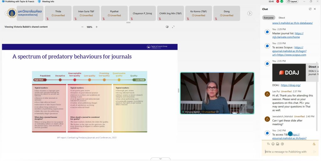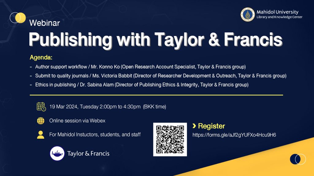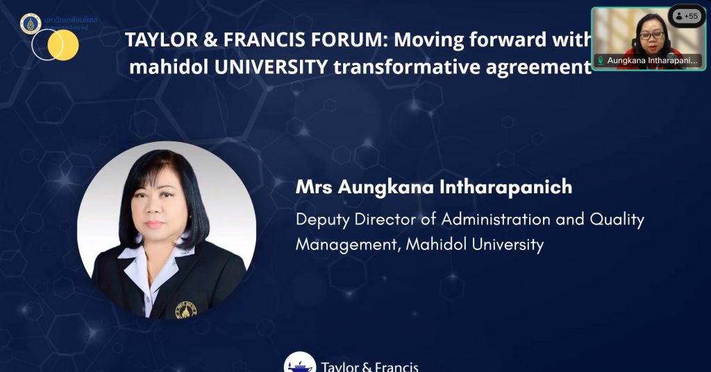 หอสมุดและคลังความรู้มหาวิทยาลัยมหิดล โดย คุณอังคณา อินทรพาณิชย์ รองผู้อำนวยการฝ่ายบริหารและพัฒนาคุณภาพห้องสมุด เป็นประธานกล่าวเปิดการอบรม “การตีพิมพ์กับสำนักพิมพ์ Taylor & Francis” ในวันอังคารที่ 19 มีนาคม 2567 ในรูปแบบออนไลน์ผ่านระบบ Cisco WebEx Meeting โดยได้รับเกียรติจาก Mr. Konno Ko, Ms. Victoria Babbit, และ Dr. Sabina Alam, Taylor & Francis Group เป็นวิทยากรบรรยายให้ความรู้ในครั้งนี้ ซึ่งมีผู้ที่สนใจเข้ารับการอบรมในครั้งนี้จำนวน 86 ท่าน เพื่อแลกเปลี่ยนเรียนรู้ขั้นตอนการส่งผลงานตีพิมพ์ในวารสารคุณภาพ จริยธรรมในการตีพิมพ์ และขั้นตอนการสนับสนุนนักวิจัย ได้อย่างมีประสิทธิภาพ