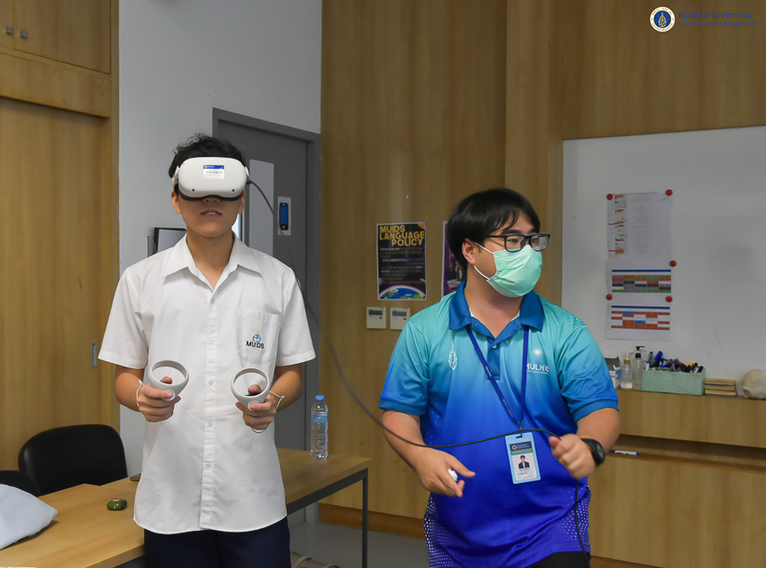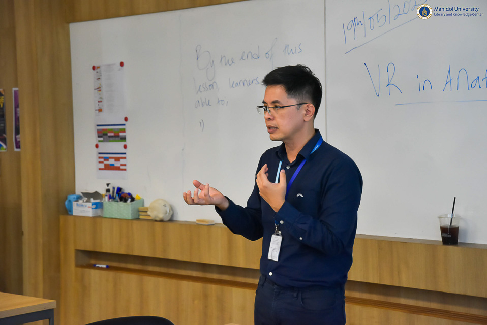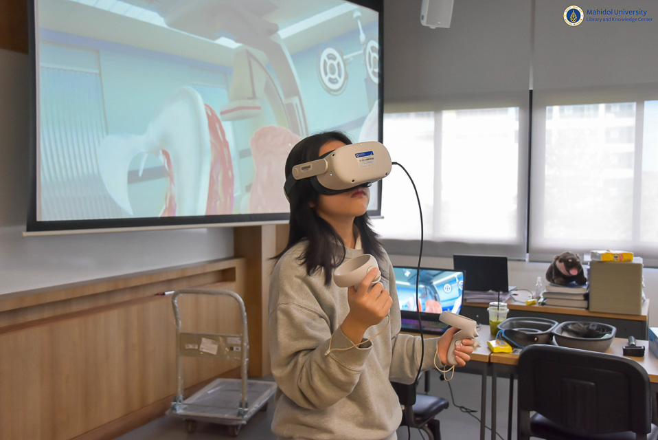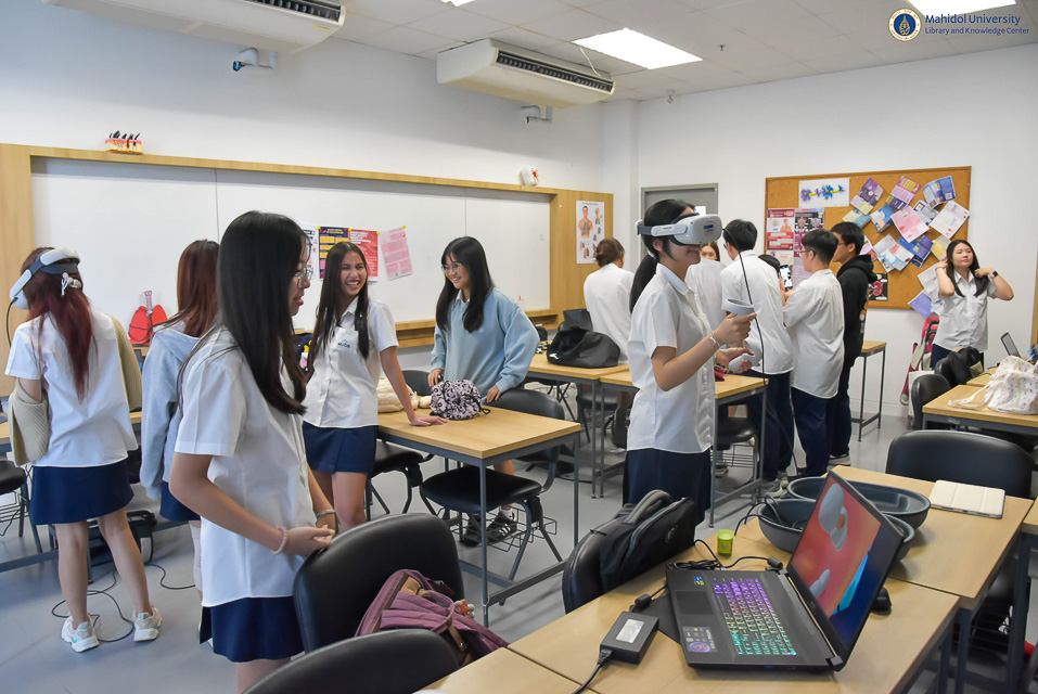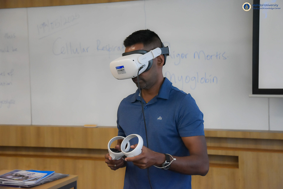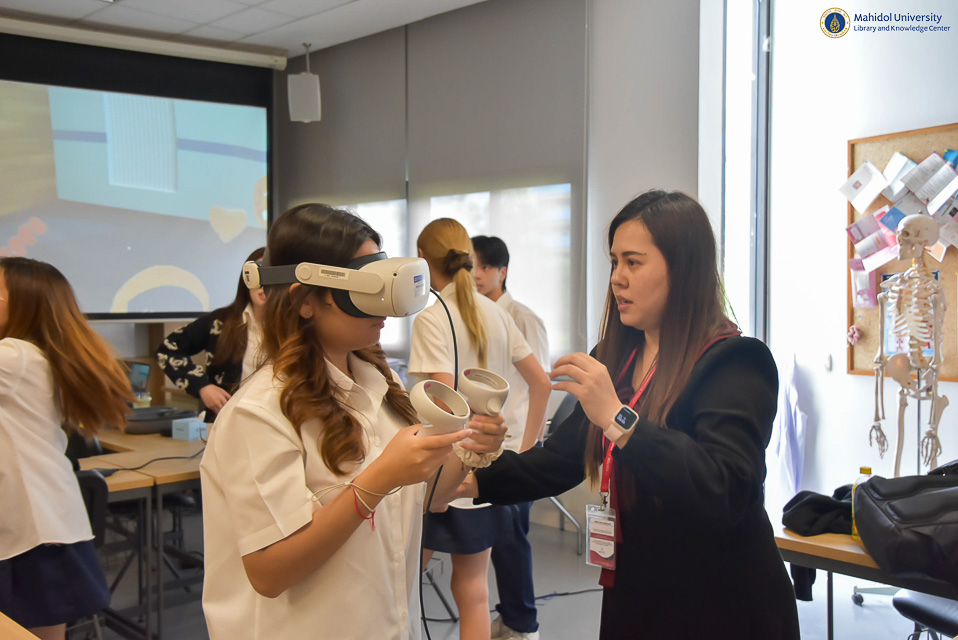 หอสมุดและคลังความรู้มหาวิทยาลัยมหิดล โดย คุณนภัสวรรณ สุพัตร นักวิชาการโสตทัศนศึกษา (ผู้ชำนาญการพิเศษ) และคุณสรวิศ อัตตปรีชากุล นักวิชาการสารสนเทศ งานเทคโนโลยีการศึกษา ได้รับเกียรติเป็นวิทยากรสาธิตการใช้แว่น VR ในหัวข้อ “การประยุกต์ใช้เทคโนโลยี VR (Virtual Reality) ในการเรียนการสอน” ให้กับคุณครูและนักเรียนภาควิชาวิทยาศาสตร์ โรงเรียนสาธิตนานาชาติ มหาวิทยาลัยมหิดล จำนวน 40 คน ในโอกาสนี้ได้รับเกียรติจาก รองศาสตราจารย์ ดร.สิงหนาท น้อมเนียน ผู้อำนวยการโรงเรียนสาธิตนานาชาติ มหาวิทยาลัยมหิดล ให้การต้อนรับ ในวันจันทร์ที่ 19 พฤษภาคม พ.ศ. 2568 ณ โรงเรียนสาธิตนานาชาติ มหาวิทยาลัยมหิดล ศาลายา กิจกรรมในครั้งนี้มีวัตถุประสงค์เพื่อส่งเสริมการเรียนรู้เชิงบูรณาการ และการใช้นวัตกรรมทางการศึกษา และเปิดโอกาสให้นักเรียนได้เรียนรู้การใช้สื่อเทคโนโลยีทางการศึกษาในรูปแบบต่าง ๆ อย่างมีประสิทธิภาพ
