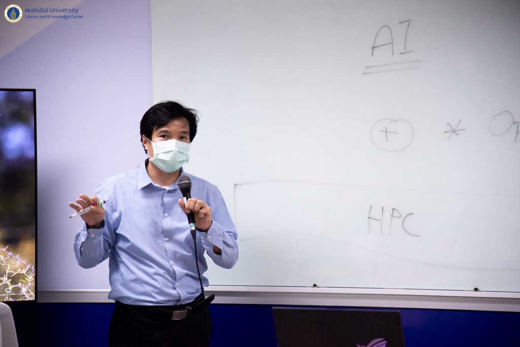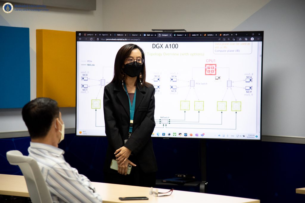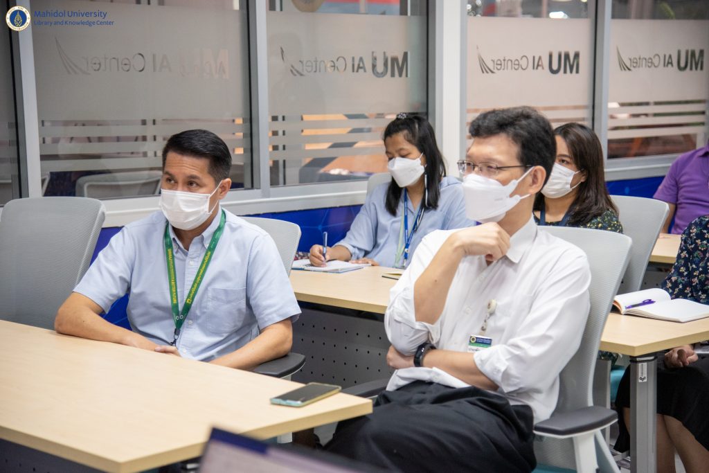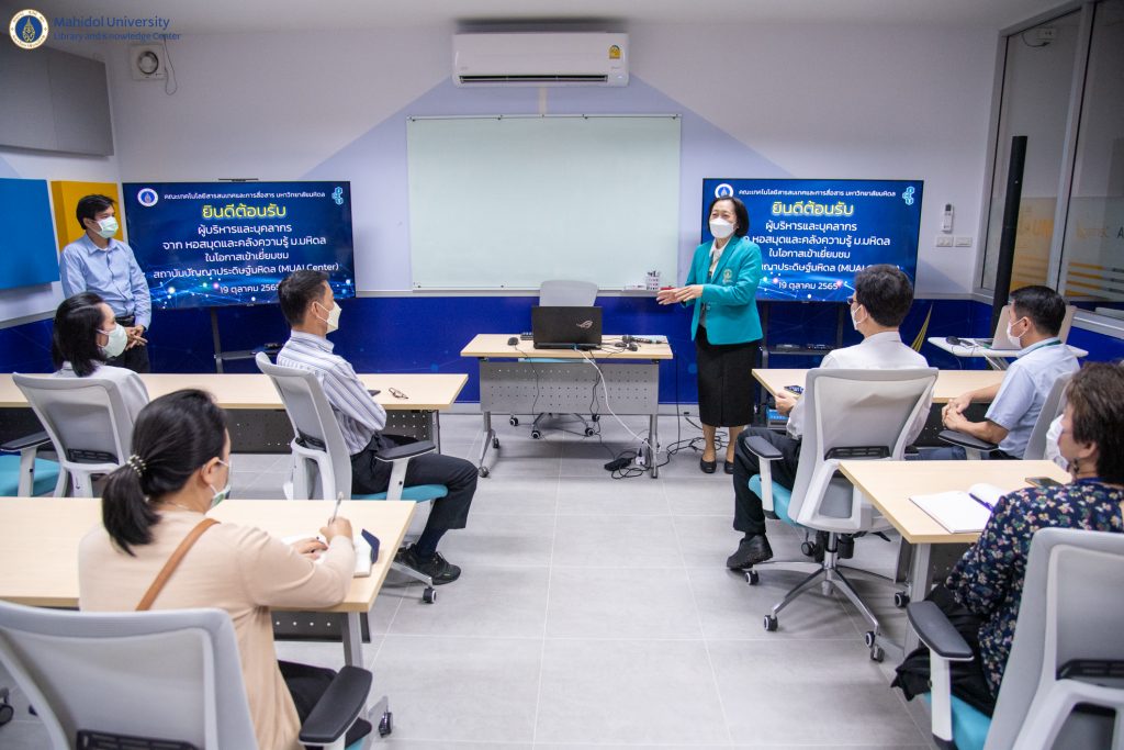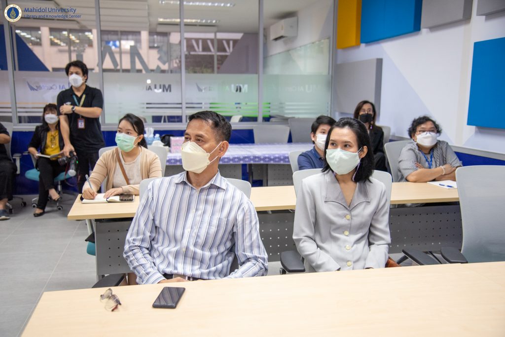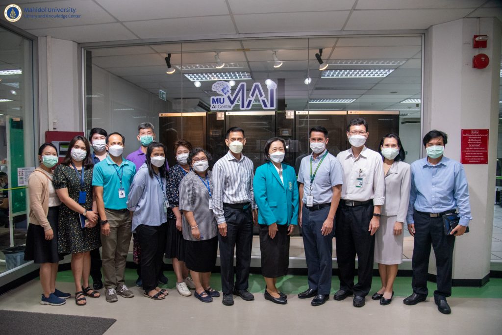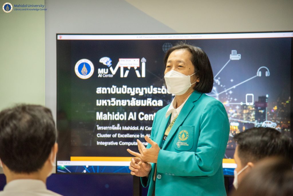 หอสมุดและคลังความรู้มหาวิทยาลัยมหิดล โดย ผู้ช่วยศาสตราจารย์ ดร.นพพล เผ่าสวัสดิ์ ผู้อำนวยการหอสมุดและคลังความรู้ฯ ดร.อภิภู สิทธิภูมิมงคล รองผู้อำนวยการฝ่ายเทคโนโลยีการศึกษาและพันธกิจพิเศษ ผู้ช่วยศาสตราจารย์ ดร.ประพัฒน์ สุริยผล รองผู้อำนวยการฝ่ายพัฒนาเทคโนโลยีสารสนเทศและนวัตกรรม ผู้ช่วยศาสตราจารย์ ดร.ทัศนียา รัตนฤาทัย นพรัตน์แจ่มจำรัส รองผู้อำนวยการฝ่ายวิจัยและวิชาการ และบุคลากรของหอสมุดและคลังความรู้ฯ จำนวน 12 คน เข้าเยี่ยมชมสถาบันปัญญาประดิษฐ์มหิดล (MU AI Center) คณะเทคโนโลยีสารสนเทศและการสื่อสาร มหาวิทยาลัยมหิดล ภายใต้โครงการ Reinventing University เมื่อวันที่ 19 ตุลาคม 2565 ที่ผ่านมา โดยได้รับเกียรติจากอาจารย์ผกาพร เพ็งศาสตร์ รองคณบดีฝ่ายวิศวกรรมและระบบ อาจารย์สนิท แสงเหลา ผู้ช่วยคณบดีฝ่ายวิศวกรรมและโครงสร้างพื้นฐาน ดร.ทิพาจินต์ ไทยพิสุทธิกุล อาจารย์ประจำกลุ่มวิชาวิทยาการคอมพิวเตอร์ ให้การต้อนรับและเป็นวิทยากรบรรยาย ในการเข้าเยี่ยมชมในครั้งนี้ โดยมีวัตถุประสงค์เพื่อเป็นการศึกษาปัญญาประดิษฐ์ (AI) ในการเรียนรู้เชิงลึกและการวิเคราะห์ข้อมูล และนำองค์ความรู้มาประยุกต์ใช้ให้เหมาะสมกับบริการของหอสมุดและคลังความรู้ฯ ในอนาคตอย่างมีประสิทธิภาพ