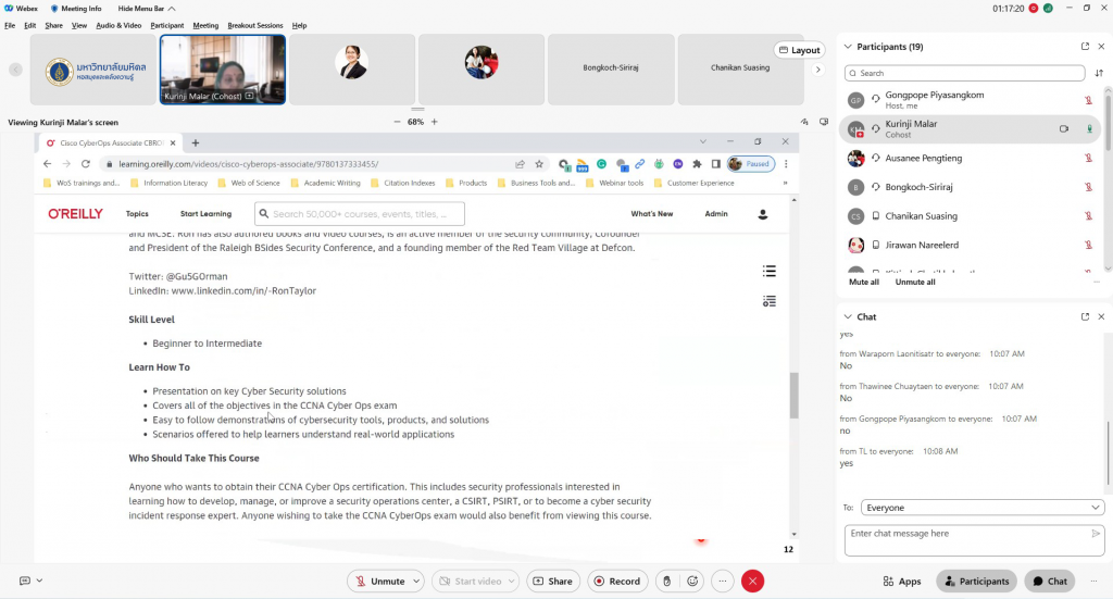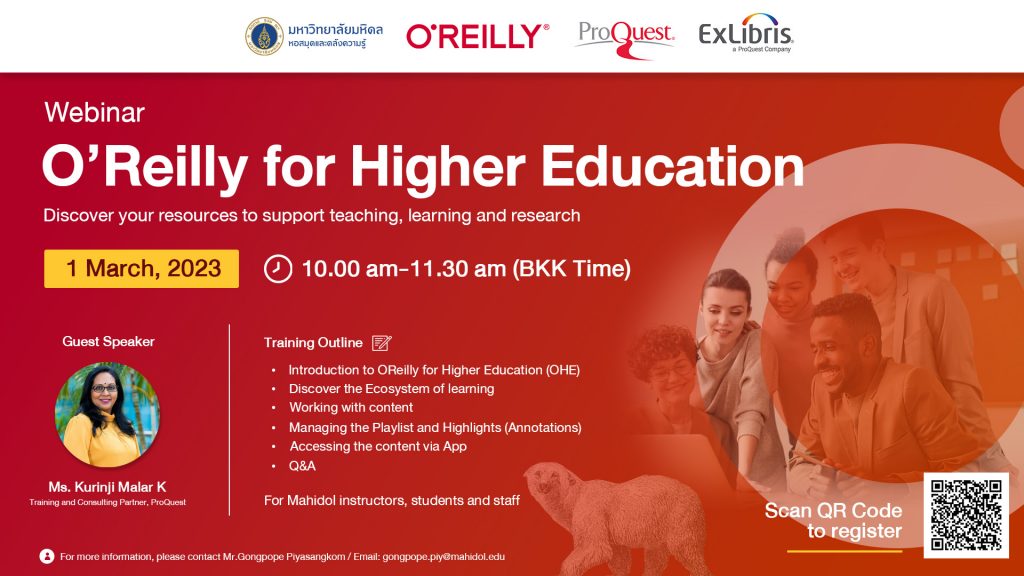 หอสมุดและคลังความรู้มหาวิทยาลัยมหิดล โดย งานพัฒนาทรัพยากรวารสาร ฝ่ายเทคนิคห้องสมุด ได้จัดอบรมบรรยายหัวข้อ “O`Reilly for Higher Education – Discover your resources to support teaching, learning and research” โดย ได้รับเกียรติจาก Ms. Kurinji Malar K ตำแหน่ง Training and Consulting Partner, ProQuest เป็นวิทยากรบรรยายให้ความรู้ในครั้งนี้ เมื่อวันพุธที่ 1 มีนาคม 2566 ที่ผ่านมา ผ่านระบบออนไลน์ Cisco WebEx Meeting ซึ่งมีจำนวนผู้เข้าร่วมอบรมทั้งสิ้น 21 คน โดยมีวัตถุประสงค์เพื่อแนะนำการใช้ฐานข้อมูล O’Reilly การเข้าถึงฐานข้อมูลและเนื้อหาผ่านแอปพลิเคชัน โดยฐานข้อมูล O`Reilly for Higher Education เหมาะสำหรับอาจารย์ นักศึกษา และบุคลากร มหาวิทยาลัยมหิดลทุกท่าน