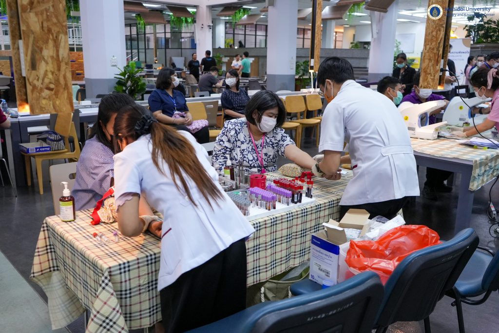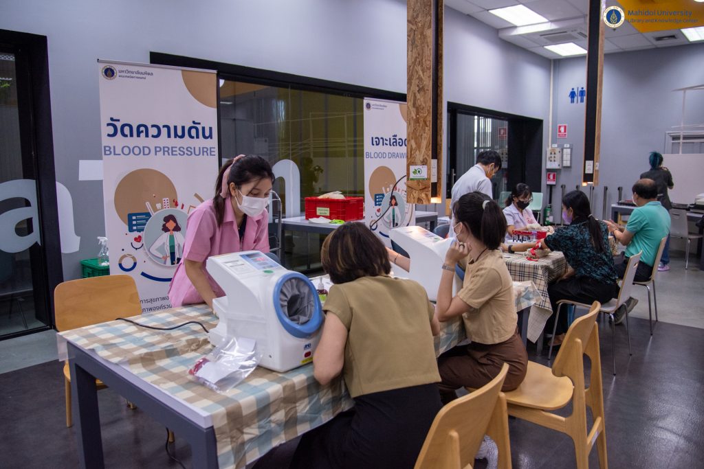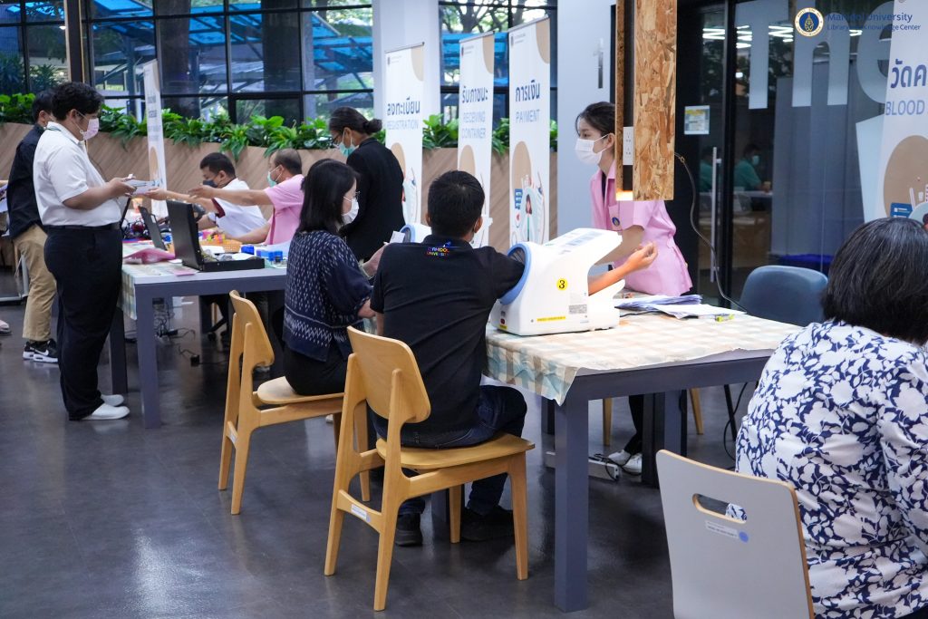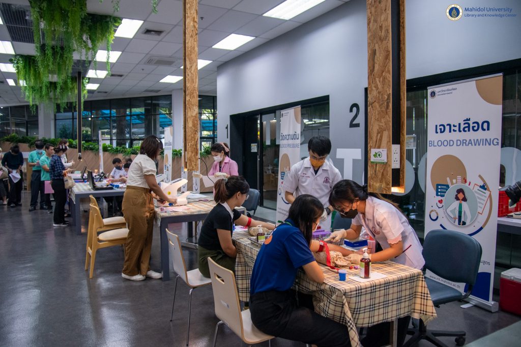 หอสมุดและคลังความรู้มหาวิทยาลัยมหิดล ได้ตระหนักถึงความสำคัญด้านสุขภาพของบุคลากร จึงได้จัดบริการตรวจประเมินสุขภาพประจำปี 2566 ให้กับบุคลากรขึ้น โดยคณะเทคนิคการแพทย์ มหาวิทยาลัยมหิดล เป็นผู้ให้บริการ เจาะเลือด วัดความดัน และ X-ray เป็นต้น เมื่อวันพุธที่ 20 ธันวาคม 2566 ณ บริเวณ Co-MU Space ชั้น 1 อาคารหอสมุดและคลังความรู้มหาวิทยาลัยมหิดล ศาลายา เพื่อส่งเสริมให้บุคลากรของหอสมุดและคลังความรู้ฯ มีสุขภาพร่างกาย สุขภาพใจ ที่แข็งแรง ปราศจากโรคภัยไข้เจ็บ ซึ่งจะนำพาองค์กรไปสู่ความเป็นเลิศได้อย่างยั่งยืนต่อไป