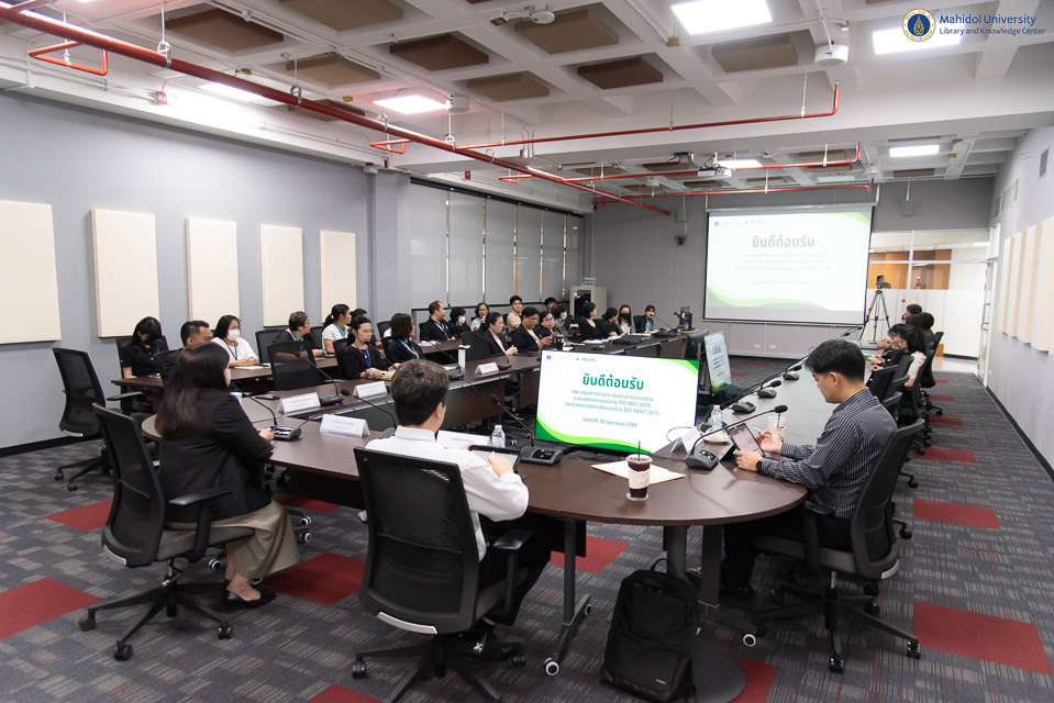หอสมุดและคลังความรู้มหาวิทยาลัยมหิดล นำโดย คุณอังคณา อินทรพาณิชย์ รองผู้อำนวยการฝ่ายบริหารและพัฒนาคุณภาพ รักษาการแทนผู้อำนวยการหอสมุดและคลังความรู้ฯ พร้อมด้วยคณะผู้บริหาร และบุคลากร ให้การต้อนรับคณะกรรมการตรวจประเมินเพื่อติดตามการรักษาระบบมาตรฐาน ISO 9001:2015 และ ISO 14001:2015 จำนวน 2 ท่าน ได้แก่ คุณพุฒิไนย เวชกามา (Lead Audit) และคุณสิรภพ พินิจการ ในวันศุกร์ที่ 20 กุมภาพันธ์ พ.ศ. 2569 ณ อาคารหอสมุดและคลังความรู้ฯ ศาลายา โดยมีวัตถุประสงค์เพื่อติดตามผลการดำเนินงานและพัฒนาระบบการบริหารจัดการด้านคุณภาพและสิ่งแวดล้อมให้เป็นไปตามมาตรฐานระดับสากล อันสะท้อนถึงความมุ่งมั่นในการยกระดับประสิทธิภาพการดำเนินงานและการให้บริการอย่างต่อเนื่องและยั่งยืน