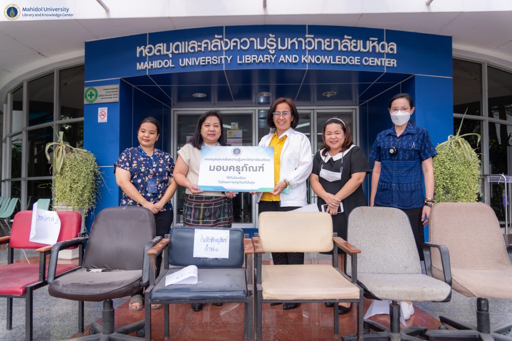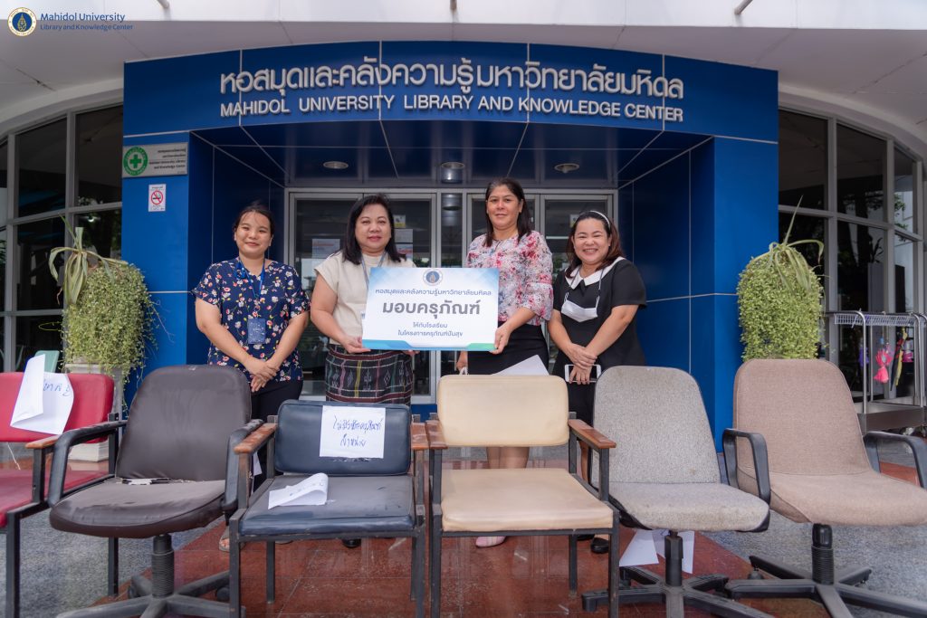 หอสมุดและคลังความรู้มหาวิทยาลัยมหิดล โดย คุณอังคณา อินทรพาณิชย์ รองผู้อำนวยการฝ่ายบริหารและพัฒนาคุณภาพห้องสมุดเป็นประธานส่งมอบครุภัณฑ์สำนักงานบริจาค ให้กับคุณพิมลมาศ สุทธิสอาด รองผู้อำนวยการสถานศึกษาโรงเรียนเทศบาล 2 วัดเสนหา (สมัครพลผดุง) และคุณลภัสรดา ทิพย์แก้ว ผู้อำนวยการสถานศึกษาโรงเรียนเทศบาล 4 (เชาวนปรีชาอุทิศ) ในวันพฤหัสบดีที่ 20 กรกฎาคม พ.ศ. 2566 ที่ผ่านมา ณ อาคารหอสมุดและคลังความรู้มหาวิทยาลัยมหิดล ศาลายา ทั้งนี้เพื่อนำไปใช้ประโยชน์ในการปฏิบัติราชการของโรงเรียนดังกล่าวต่อไป ซึ่งเป็นหนึ่งในโครงการพันธกิจเพื่อสังคม และโครงการหอสมุดและคลังความรู้มหาวิทยาลัยมหิดล ปันสุข ครุภัณฑ์ เพื่อชุมชน