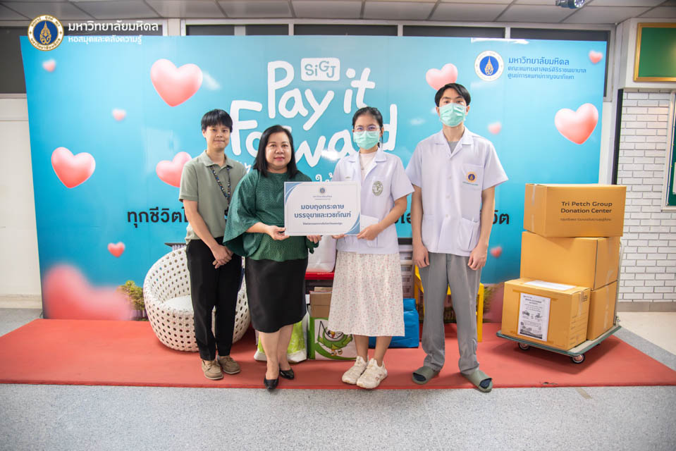 หอสมุดและคลังความรู้มหาวิทยาลัยมหิดล โดย คุณอังคณา อินทรพาณิชย์ รองผู้อำนวยการฝ่ายบริหารและพัฒนาคุณภาพ และประธานคณะทำงานสร้างสุของค์กรและบุคลากรสัมพันธ์ เป็นผู้แทนส่งมอบถุงกระดาษบรรจุยาและเวชภัณฑ์ จำนวน 4,000 ใบ ให้แก่สถานพยาบาลในจังหวัดนครปฐม จำนวน 2 แห่ง โดยมี คุณยุทธกรานต์ ชินโสตร นายแพทย์เชี่ยวชาญ (ด้านสาธารณสุข) ผู้อำนวยการโรงพยาบาลพุทธมณฑล และผู้แทนจากศูนย์การแพทย์กาญจนาภิเษก ในวันพฤหัสบดีที่ 20 มีนาคม พ.ศ. 2568 ซึ่งถุงกระดาษทั้งหมดในครั้งนี้ เป็นการรับบริจาคจากประชาชนทั่วไป โดยได้รับความร่วมมือจากนักเรียน นักศึกษาที่เข้าร่วมในกิจกรรม CSR Day วันจิตอาสาพัฒนาห้องสมุด ในการจัดทำใบมอบความรู้เกี่ยวกับการดูแลสุขภาพร่างกาย และการรับประทานยาอย่างถูกวิธี เพื่อเป็นการรณรงค์และอนุรักษ์สิ่งแวดล้อมด้วยการลดปริมาณขยะจากถุงกระดาษ และส่งต่อให้สถานพยาบาลโดยรอบมหาวิทยาลัยมหิดลต่อไป