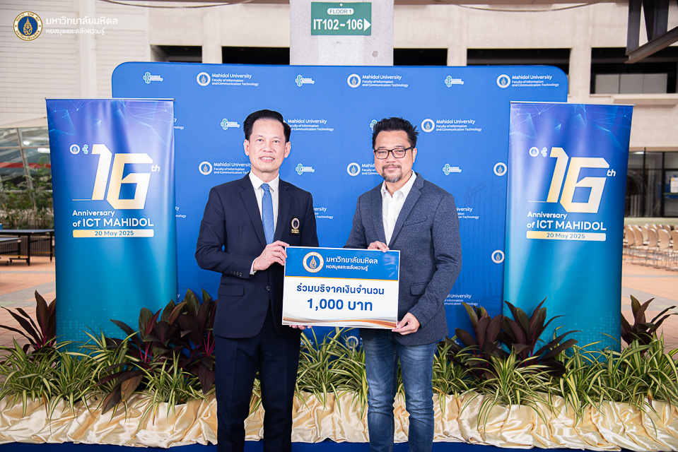 หอสมุดและคลังความรู้มหาวิทยาลัยมหิดล โดย ผู้ช่วยศาสตราจารย์ ดร.สราวุธ เวชกิจ ผู้อำนวยการหอสมุดและคลังความรู้ฯ ร่วมแสดงความยินดีเนื่องในโอกาสครบรอบ 16 ปี วันคล้ายวันสถาปนาคณะเทคโนโลยีสารสนเทศและการสื่อสาร มหาวิทยาลัยมหิดล โดยมอบเงินบริจาคจำนวน 1,000 บาท ให้กับดร.พัฒนศักดิ์ มงคลวัฒน์ คณบดีคณะเทคโนโลยีสารสนเทศและการสื่อสาร มหาวิทยาลัยมหิดล ในวันอังคารที่ 20 พฤษภาคม พ.ศ. 2568 ณ ลาน Innovative Space ชั้น 1 อาคารคณะเทคโนโลยีสารสนเทศและการสื่อสารฯ