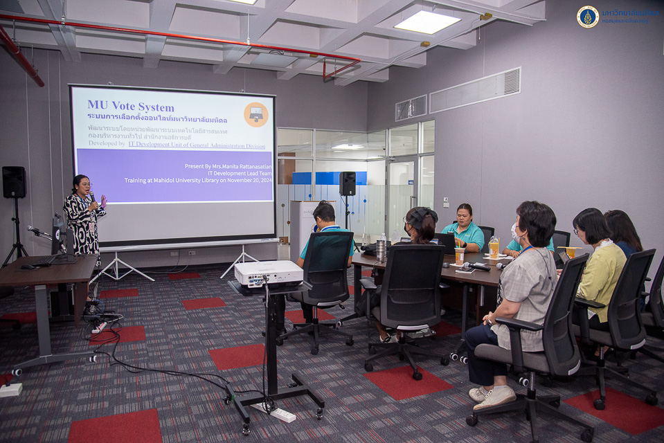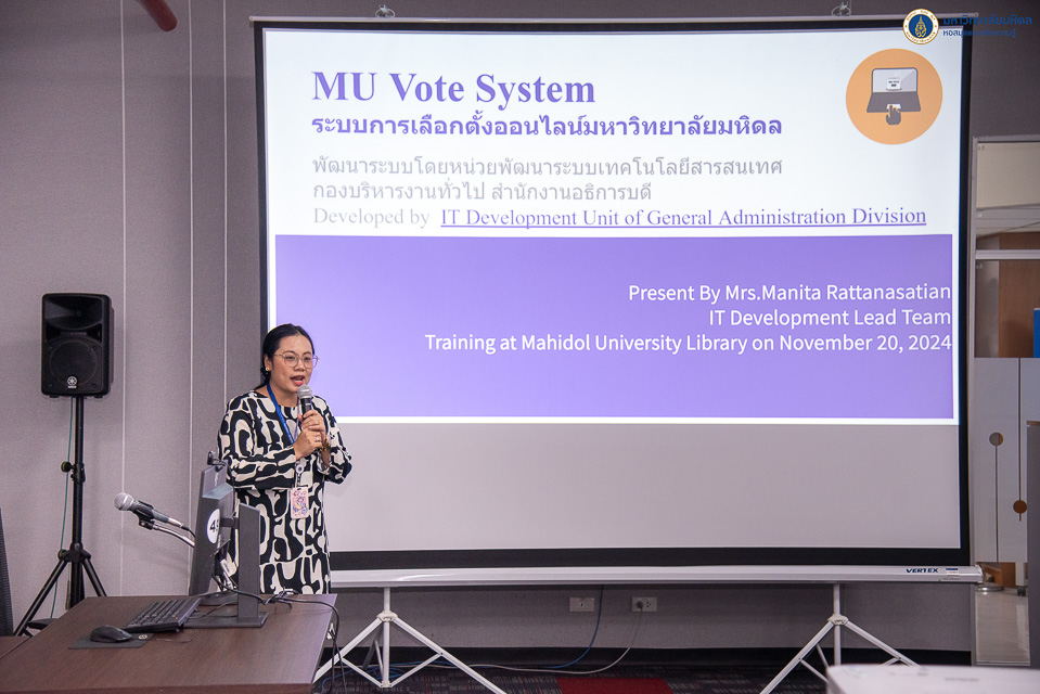หอสมุดและคลังความรู้มหาวิทยาลัยมหิดล โดย คุณอังคณา อินทรพาณิชย์ รองผู้อำนวยการฝ่ายบริหารและพัฒนาคุณภาพ เป็นประธานกล่าวเปิดการอบรมการใช้งานระบบ MU Vote ในวันพุธที่ 20 พฤศจิกายน พ.ศ. 2567 ณ ห้องประชุม 2 ชั้น 3 อาคารหอสมุดและคลังความรู้ฯ ศาลายา โดยได้รับเกียรติจาก คุณมนิตา รัตนสเถียร หัวหน้าหน่วยพัฒนาระบบเทคโนโลยีสารสนเทศ และคุณอวยชัย แสงฟ้า เจ้าหน้าที่ระบบงานคอมพิวเตอร์ กองบริหารงานทั่วไป เป็นวิทยากรให้ความรู้วิธีการใช้งานระบบ MU Vote เพื่อใช้ประโยชน์ด้านต่าง ๆ ภายในหอสมุดและคลังความรู้ฯ อย่างมีประสิทธิภาพ โดยระบบ MU Vote คือ ระบบการเลือกตั้งออนไลน์ของมหาวิทยาลัยมหิดล มีวัตถุประสงค์เพื่อให้กระบวนการการเลือกตั้ง สามารถดำเนินการได้อย่างสะดวก คล่องตัว และสามารถปกปิดผลการลงคะแนนของผู้ลงคะแนนได้อย่างปลอดภัย อีกทั้งการพัฒนาระบบดังกล่าวยังถือเป็นการช่วยสนับสนุนกลยุทธ์ด้าน Digital University ของมหาวิทยาลัยมหิดล