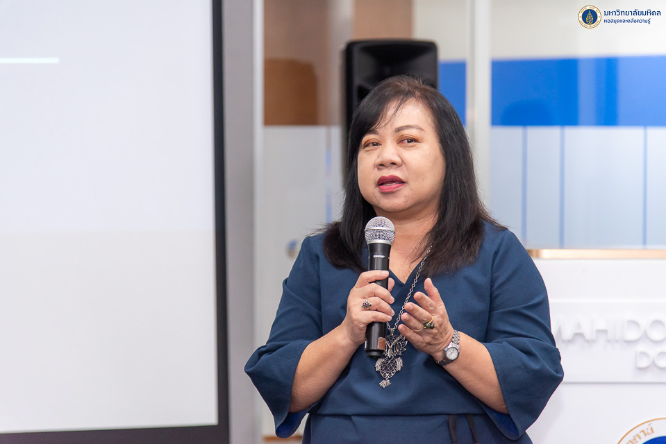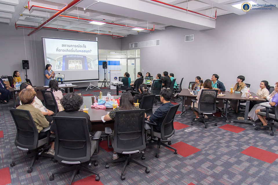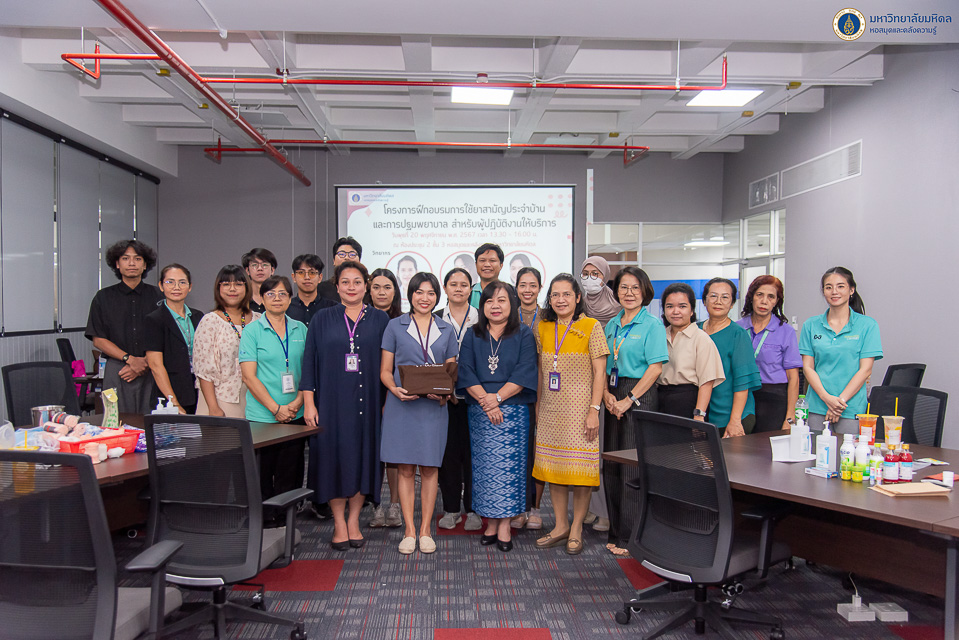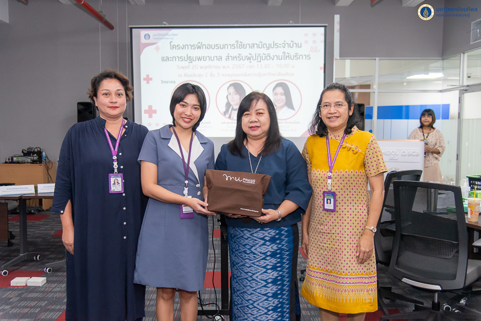 หอสมุดและคลังความรู้มหาวิทยาลัยมหิดล โดย คุณอังคณา อินทรพาณิชย์ รองผู้อำนวยการฝ่ายบริหารและพัฒนาคุณภาพ เป็นประธานกล่าวเปิด “โครงการฝึกอบรมการใช้ยาสามัญประจำบ้านและการปฐมพยาบาล สำหรับผู้ปฏิบัติงานให้บริการ” ในวันพุธที่ 20 พฤศจิกายน พ.ศ. 2567 ณ ห้องประชุม 2 ชั้น 3 อาคารหอสมุดและคลังความรู้ฯ ศาลายา โดยได้รับเกียรติจากวิทยากรผู้ทรงคุณวุฒิ ได้แก่ อาจารย์ ดร.อภรชา ลำดับวงศ์ รองหัวหน้าสาขาวิชาการพยาบาลพื้นฐาน ผู้ช่วยศาสตราจารย์ สุภลักษณ์ เชยชม อาจารย์พยาบาล และอาจารย์ชนิสรา ชื่นชมน้อย ผู้ช่วยอาจารย์ โรงเรียนพยาบาลรามาธิบดี คณะแพทยศาสตร์โรงพยาบาลรามาธิบดี มหาวิทยาลัยมหิดล ในการบรรยายให้ความรู้แก่บุคลากรหอสมุดและคลังความรู้ฯ ผู้มีความจำเป็นต้องปฏิบัติงานให้บริการ ในการใช้ยาสามัญประจำบ้านและวิธีการปฐมพยาบาลเบื้องต้นอย่างถูกต้องเหมาะสม เพื่อเตรียมความพร้อมรับมือสถานการณ์ฉุกเฉินที่อาจเกิดขึ้นได้