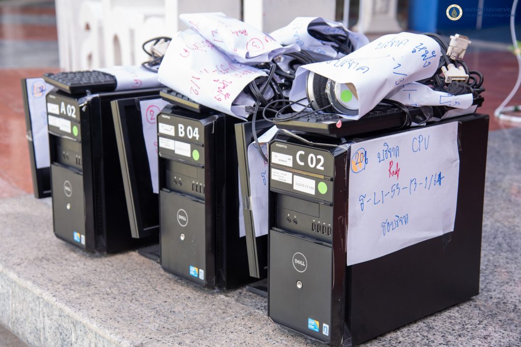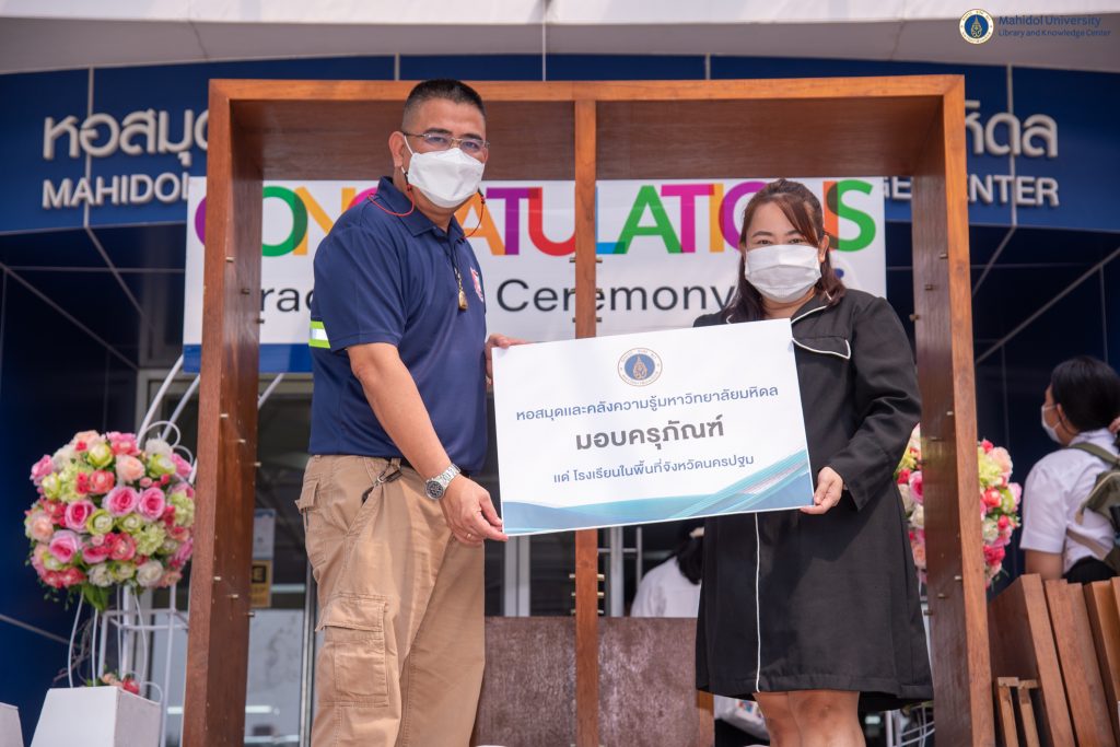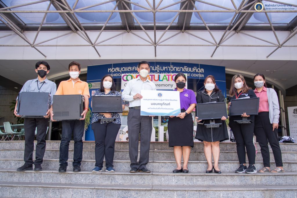 หอสมุดและคลังความรู้มหาวิทยาลัยมหิดล โดย ดร.อภิภู สิทธิภูมิมงคล รองผู้อำนวยการฝ่ายเทคโนโลยีการศึกษาและพันธกิจพิเศษ เป็นประธานส่งมอบชุดอุปกรณ์คอมพิวเตอร์ ให้กับคุณนภา วานิชกร คุณครูประจำโรงเรียนนวัดไร่ขิง (สุนทรอุทิศ) และส่งมอบครุภัณฑ์สำนักงานให้กับ พ.ต.ท.สัญญา รัตนไพวงศ์ อาจารย์ (สบ 3) หัวหน้าฝ่ายวิชาการ กลุ่มงานพลศึกษาและต่อสู้ป้องกันตัว ศูนย์ฝึกตำรวจ โรงเรียนนายร้อยตำรวจ อ.สามพราน ในวันพฤหัสบดีที่ 20 ตุลาคม 2565 ที่ผ่านมา ณ อาคารหอสมุดและคลังความรู้มหาวิทยาลัยมหิดล ศาลายา ทั้งนี้เพื่อนำไปใช้ประโยชน์ในการปฏิบัติราชการของโรงเรียนดังกล่าวต่อไป ซึ่งเป็นหนึ่งในโครงการหอสมุดและคลังความรู้มหาวิทยาลัยมหิดล ปันสุข ครุภัณฑ์ เพื่อชุมชน
