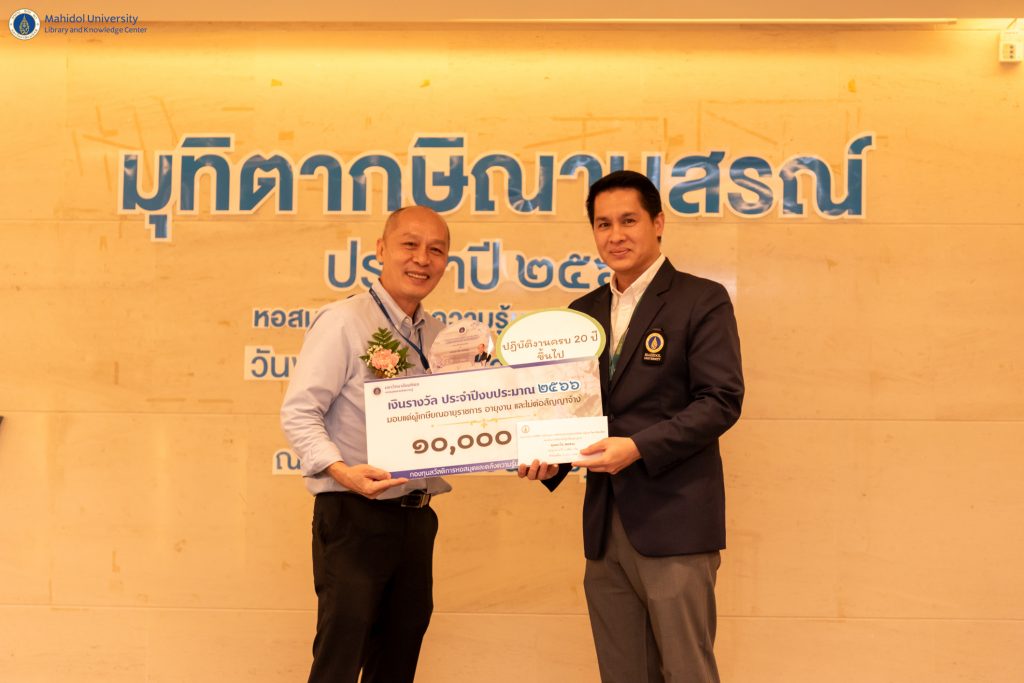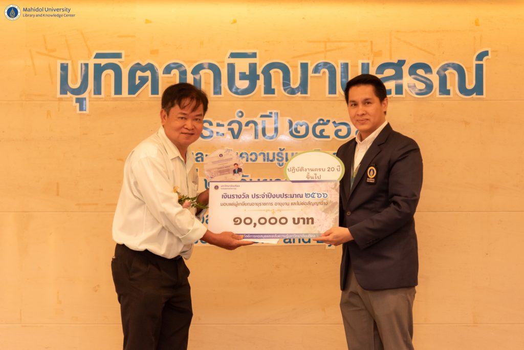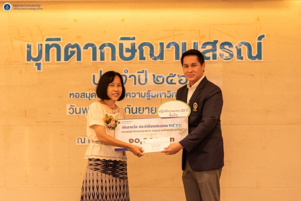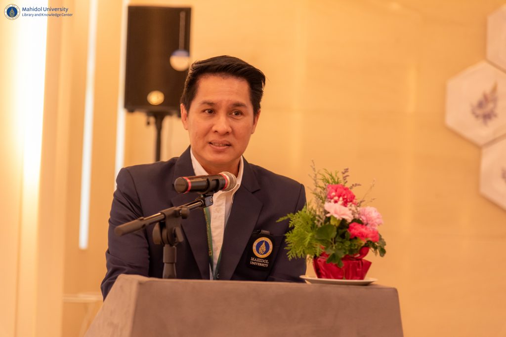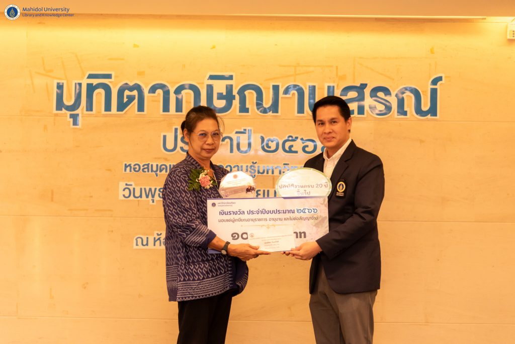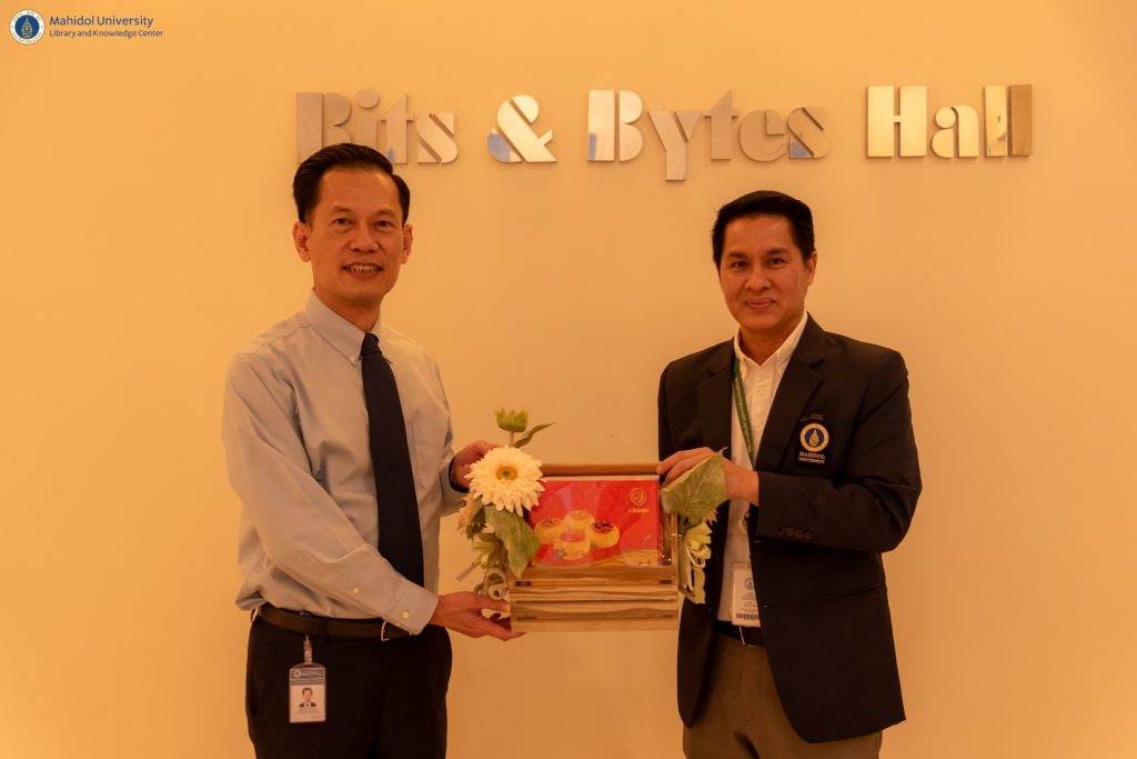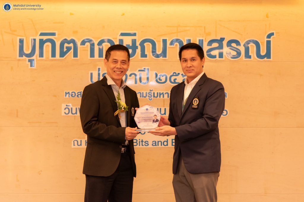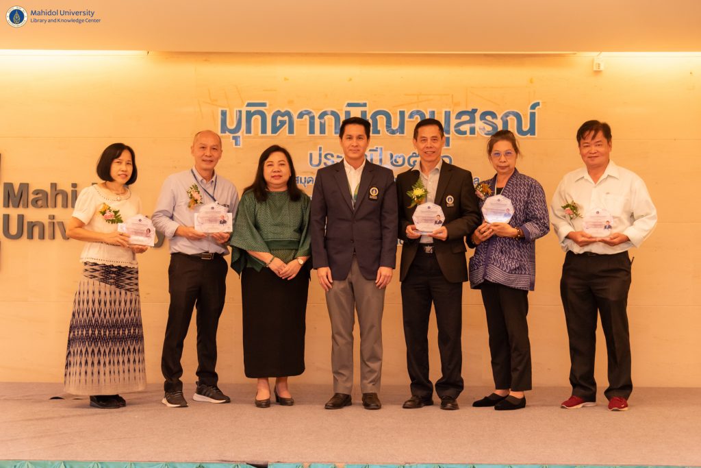 จากนั้น ผู้ช่วยศาสตราจารย์ ดร.นพพล เผ่าสวัสดิ์ ผู้อำนวยการหอสมุดและคลังความรู้ฯ เป็นประธานในพิธีกล่าวเปิดกิจกรรมมุทิตากษิณานุสรณ์ ประจำปี 2566 และมอบของที่ระลึก แด่บุคลากรผู้เกษียณอายุราชการ ของหอสมุดและคลังความรู้ฯ ณ ห้องประชุม Bits & Byte ชั้น 4 คณะเทคโนโลยีสารสนเทศและการสื่อสาร มหาวิทยาลัยมหิดล เพื่อร่วมแสดงมุทิตาจิตและเพื่อยกย่องเชิดชูเกียรติ คุณงามความดีของผู้เกษียณอายุงานที่ได้ตั้งใจปฏิบัติงาน ด้วยความวิริยะอุตสาหะตลอดมา โดยในปี 2566 นี้ มีบุคลากรผู้เกษียณอายุราชการ จำนวน 7 ท่าน ดังนี้ ดร.อภิภู สิทธิภูมิมงคล รองผู้อำนวยการฝ่ายเทคโนโลยีการศึกษาและพันธกิจพิเศษ คุณตะวัน พลชนะ หัวหน้าหน่วยอาคารสถานที่และยานพาหนะ คุณณัชชา อินทร์โชติ ผู้ปฏิบัติงานบริหาร (ผู้ชำนาญงาน) หน่วยการเงินและบัญชี คุณสังวร ขนทอง ช่างไม้ หน่วยอาคารสถานที่และยานพาหนะ คุณทวี มานะธำรง บรรณารักษ์ (ผู้ชำนาญการ) หอสมุดกลาง คุณวนิดา จันทร์ศรี ผู้ปฏิบัติงานห้องสมุด (ผู้ชำนาญงาน) ห้องสมุดวิทยาเขตราชวิถี และคุณจินตนา แย้มขจร ผู้ปฏิบัติงานห้องสมุด (ผู้ชำนาญงาน) หอสมุดกลาง ในโอกาสนี้ หอสมุดและคลังความรู้ฯ ได้มอบของที่ระลึกให้กับ ดร.พัฒนศักดิ์ มงคลวัฒน์ คณบดี คณะเทคโนโลยีสารสนเทศและการสื่อสาร มหาวิทยาลัยมหิดล ที่อนุเคราะห์ให้ใช้สถานที่ของคณะเทคโนโลยีสารสนเทศและการสื่อสาร มหาวิทยาลัยมหิดล