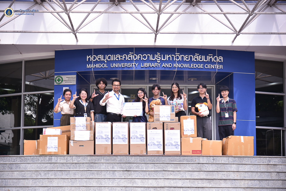 หอสมุดและคลังความรู้มหาวิทยาลัยมหิดล โดย ผู้ช่วยศาสตราจารย์ ดร.สราวุธ เวชกิจ ผู้อำนวยการหอสมุดและคลังความรู้ เป็นประธานส่งมอบสิ่งของบริจาคภายใต้