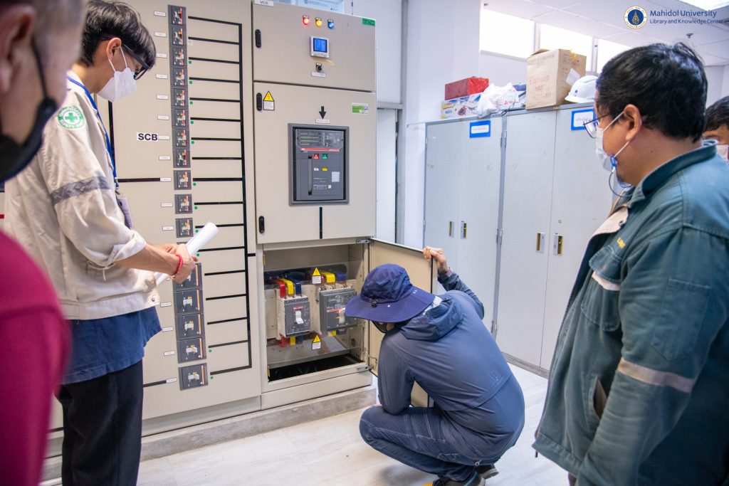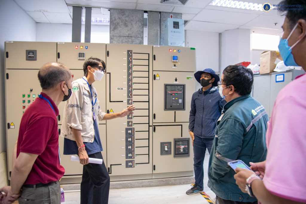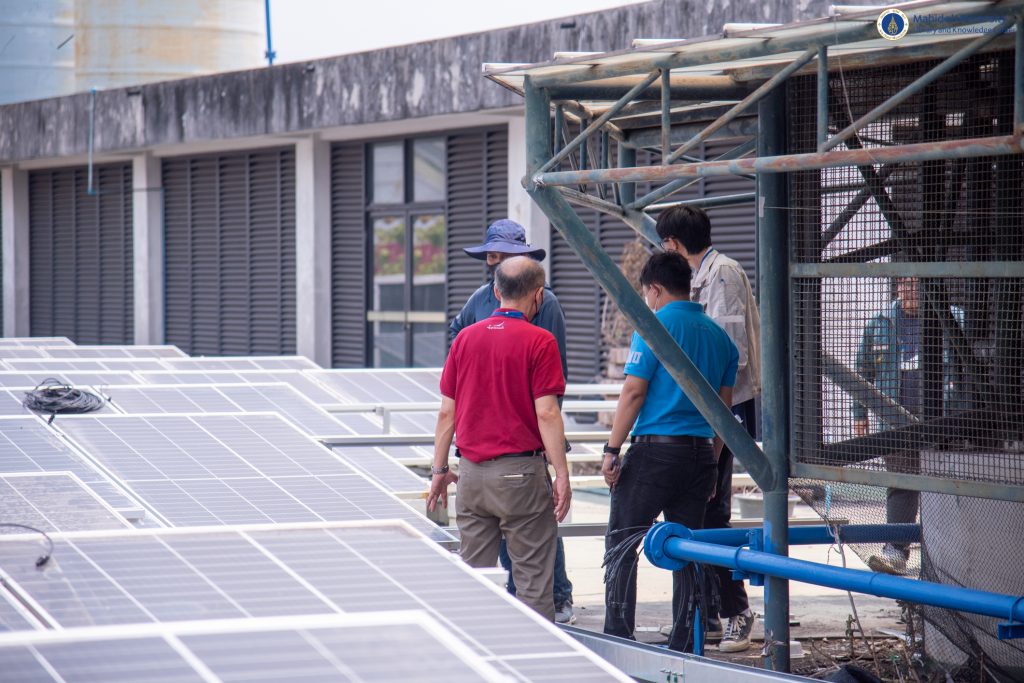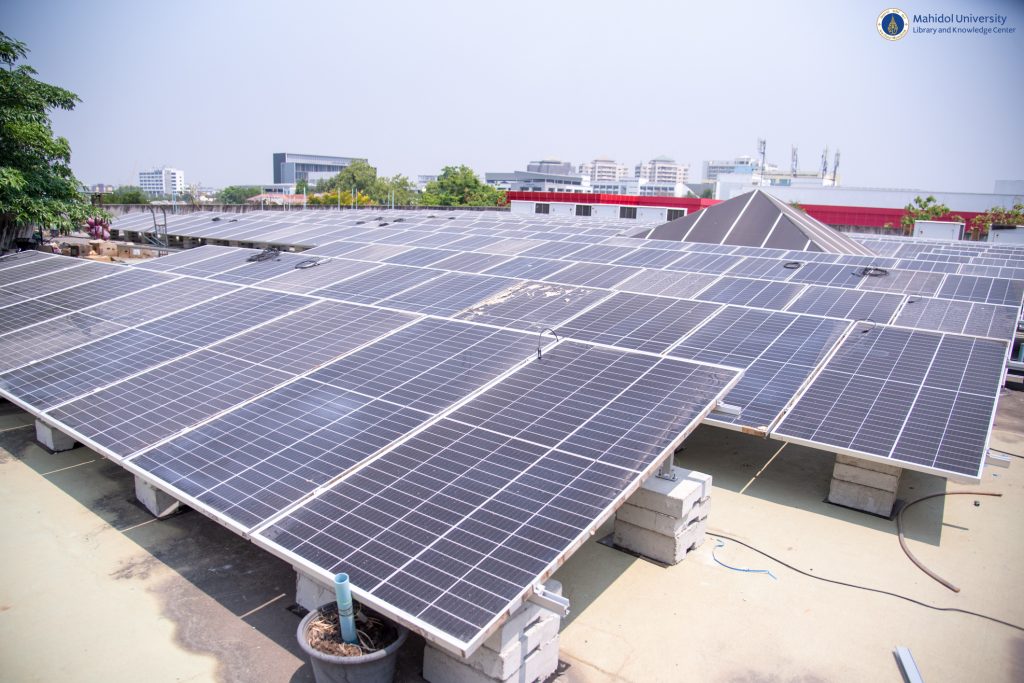 กองกายภาพและสิ่งแวดล้อม มหาวิทยาลัยมหิดล ดำเนินการติดตั้งแผงโซล่าเซลล์ ซึ่งสามารถผลิตกระแสไฟฟ้าได้ 309.06 กิโลวัตต์ต่อชั่วโมง ณ บริเวณชั้นดาดฟ้า อาคารหอสมุดและคลังความรู้มหาวิทยาลัยมหิดล เมื่อวันศุกร์ที่ 21 เมษายน 2566 ที่ผ่านมา โดย หน่วยอาคารสถานที่และยานพาหนะ งานบริหารและธุรการ หอสมุดและคลังความรู้มหาวิทยาลัยมหิดล ร่วมตรวจสอบงานติดตั้งระบบ Solar Rooftop เพื่อดำเนินการต่อระบบจ่ายไฟฟ้าเข้าอาคารหอสมุดและคลังความรู้ฯ ซึ่งอยู่ภายใต้สัญญาความร่วมมือพัฒนาโครงการการใช้พลังงานทดแทนจากพลังงงานแสงอาทิตย์ (Solar Cells) ภายในมหาวิทยาลัยมหิดล ระหว่างมหาวิทยาลัยมหิดล และ บริษัท เอสพีพี ซิค จำกัด โดยมีเป้าหมายเพื่อลดปริมาณการปล่อยก๊าซเรือนกระจกได้ 10,487 ตันต่อปี หรือ 21% และจะปล่อยก๊าซเรือนกระจกสุทธิเป็นศูนย์ (Net Zero Emission) ภายในปี พ.ศ.2573