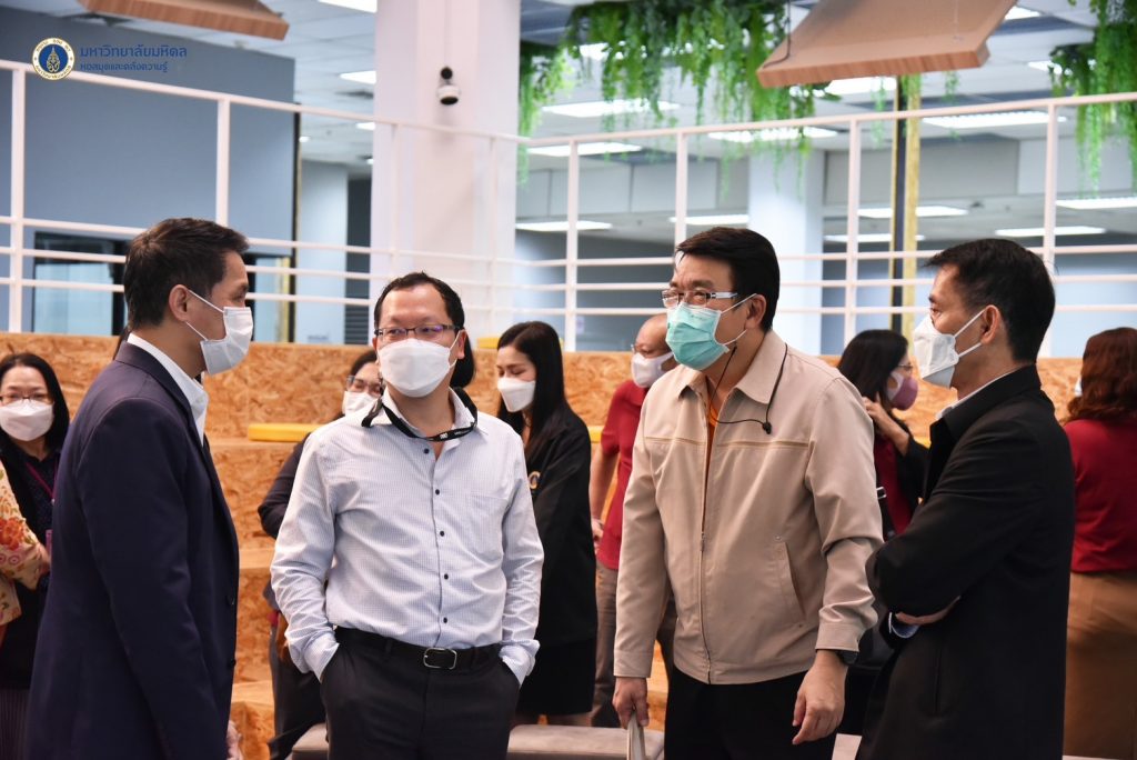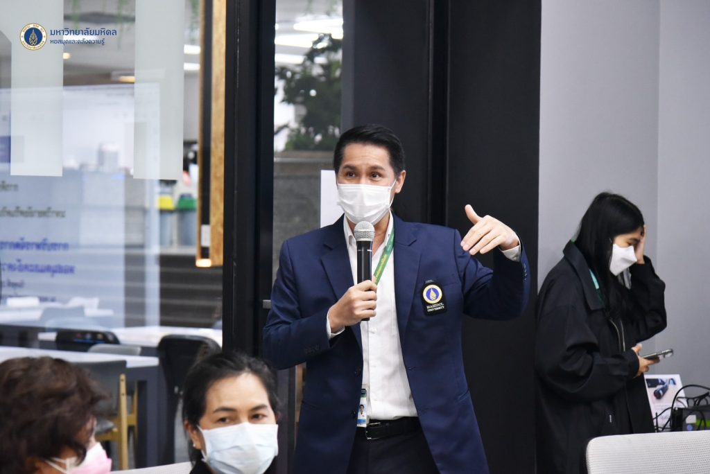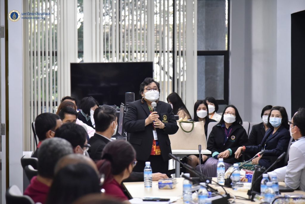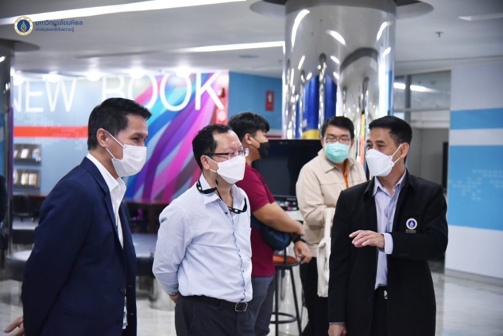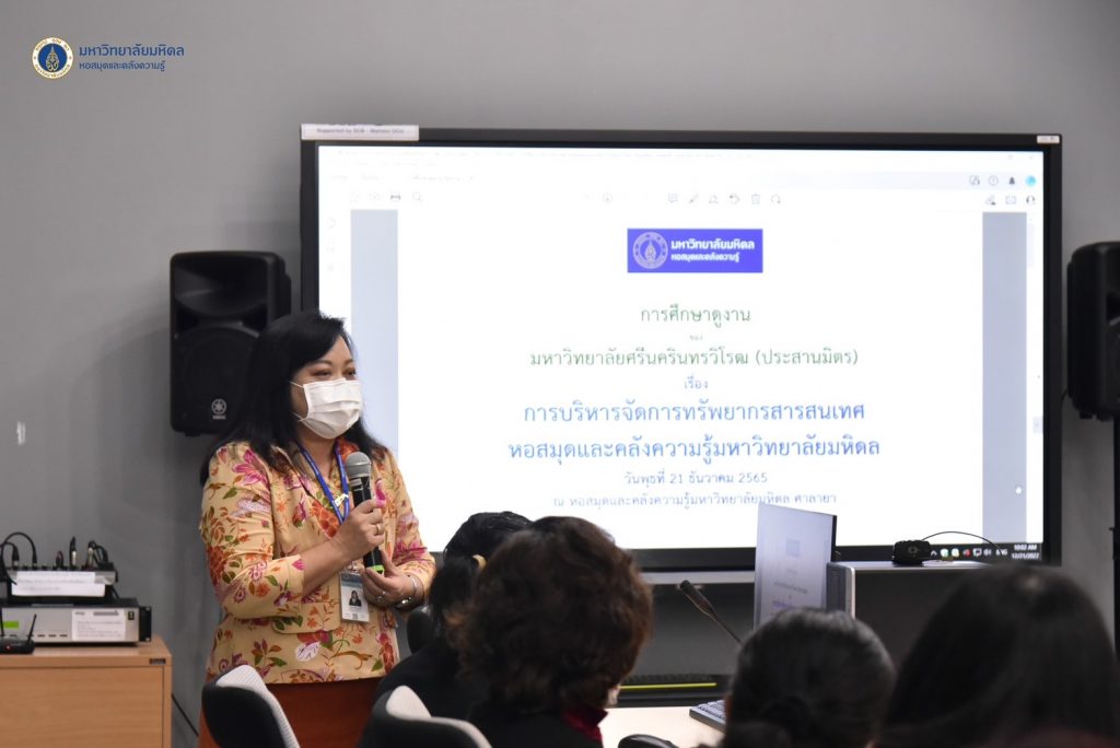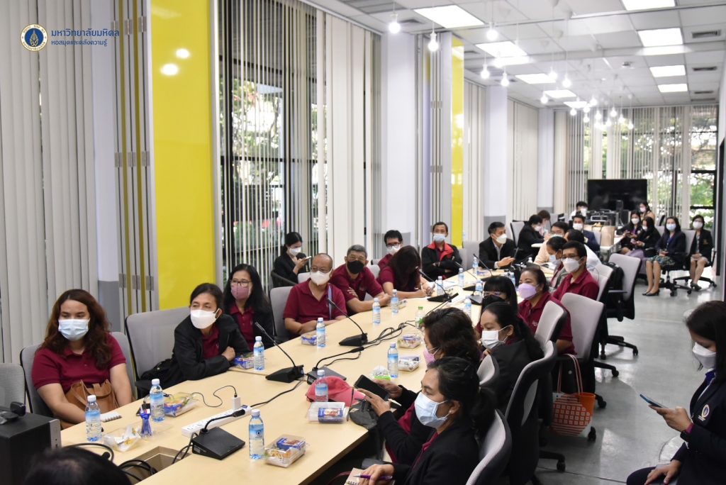 หอสมุดและคลังความรู้มหาวิทยาลัยมหิดล โดย คณะผู้บริหาร ประกอบด้วย ผู้ช่วยศาสตราจารย์ ดร.นพพล เผ่าสวัสดิ์ ผู้อำนวยการหอสมุดและคลังความรู้ฯ คุณอังคณา อินทรพาณิชย์ รองผู้อำนวยการฝ่ายบริหารและพัฒนาคุณภาพห้องสมุด ดร.อภิภู สิทธิภูมิมงคล รองผู้อำนวยการฝ่ายเทคโนโลยีการศึกษาและพันธกิจพิเศษ และบุคลากรของหอสมุดและคลังความรู้มหาวิทยาลัยมหิดล ให้การต้อนรับคณะผู้ศึกษาดูงานจาก สำนักหอสมุดกลาง มหาวิทยาลัยศรีนครินทรวิโรฒ จำนวนทั้งสิ้น 20 คน นำโดย รศ.นพ.วิศาล มหาสิทธิวัฒน์ ผู้อำนวยการสำนักหอสมุดกลาง มหาวิทยาลัยศรีนครินทรวิโรฒ ผศ.ดร.วีรยุทธ เจริญเรืองกิจ รองผู้อำนวยการฝ่ายเทคโนโลยีสารสนเทศ และคุณมาลินี ภูหมั่นเพียร หัวหน้าฝ่ายบริหารจัดการทรัพยากรสารสนเทศ เมื่อวันพุธที่ 21 ธันวาคม 2565 ที่ผ่านมา ณ ห้อง Platoon ชั้น 1 อาคารหอสมุดและคลังความรู้มหาวิทยาลัยมหิดล ศาลายา โดยมีวัตถุประสงค์เพื่อศึกษาและเรียนรู้ทักษะด้านการจัดการทรัพยากรสารสนเทศและเทคโนโลยีห้องสมุดในด้านต่าง ๆ ของหอสมุดและคลังความรู้ฯ เพื่อแลกเปลี่ยนเรียนรู้ และนำองค์ความรู้ประสบการณ์การให้บริการ มาประยุกต์ใช้ให้เกิดประสิทธิภาพสูงสุด