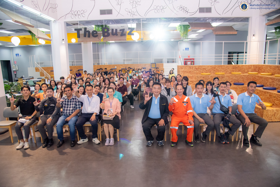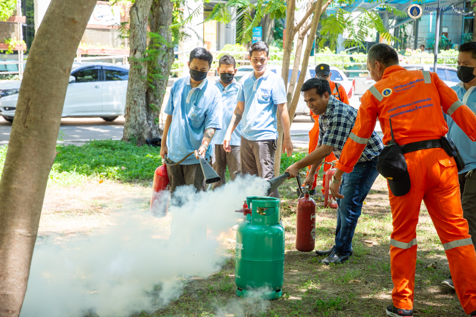 คณะกรรมการความปลอดภัย อาชีวอนามัย และสภาพแวดล้อมในการทำงาน หอสมุดและคลังความรู้มหาวิทยาลัยมหิดล จัดการฝึกอบรมเชิงปฏิบัติการซ้อมแผนอพยพหนีไฟ
