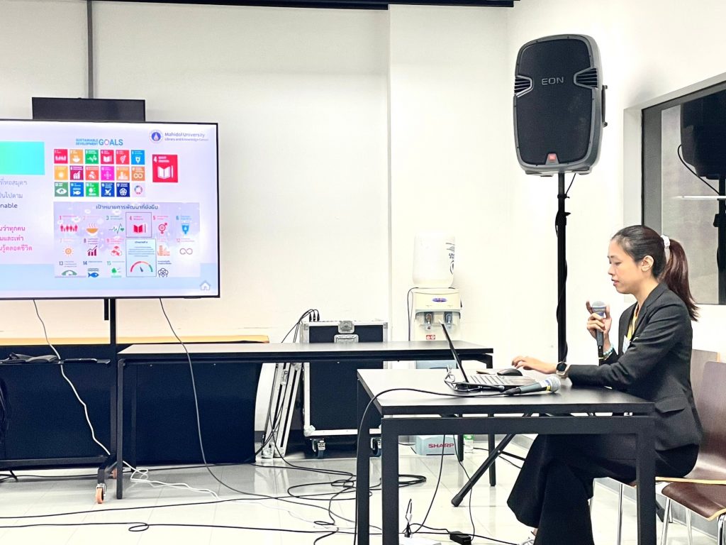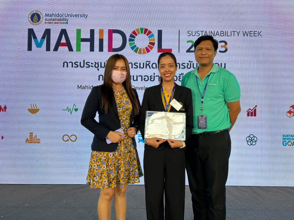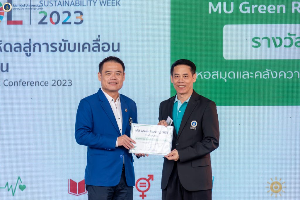 ในโอกาสนี้ หอสมุดและคลังความรู้มหาวิทยาลัยมหิดล โดย ดร.อภิภู สิทธิภูมิมงคล รองผู้อำนวยการฝ่ายเทคโนโลยีการศึกษาและพันธกิจพิเศษ เป็นผู้แทนหอสมุดและคลังความรู้ฯ เข้ารับรางวัล MU GREEN RANKING 2022 ประเภทรางวัลชมเชย จากการประกวดผลการดำเนินงานด้านการพัฒนาสิ่งแวดล้อมอย่างยั่งยืน มหาวิทยาลัยมหิดล ประจำปี 2565 ที่ผ่านมา พร้อมกันนี้ คุณปัทมาภรณ์ แสงสว่าง นักวิชาการโสตทัศนศึกษา งานเทคโนโลยีสารสนเทศ หอสมุดและคลังความรู้ฯ ได้ผ่านการพิจารณาจากผู้ทรงคุณวุฒิให้ร่วมนำเสนอผลงานแบบบรรยายปากเปล่า (Oral Presentation) เรื่อง “การศึกษาเปรียบเทียบการใช้งานระบบบริการ MU Digital e-Lecture แบบออนไซต์ (Onsite) กับแบบออนไลน์ (Online)”