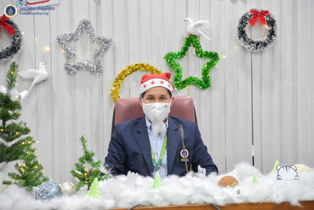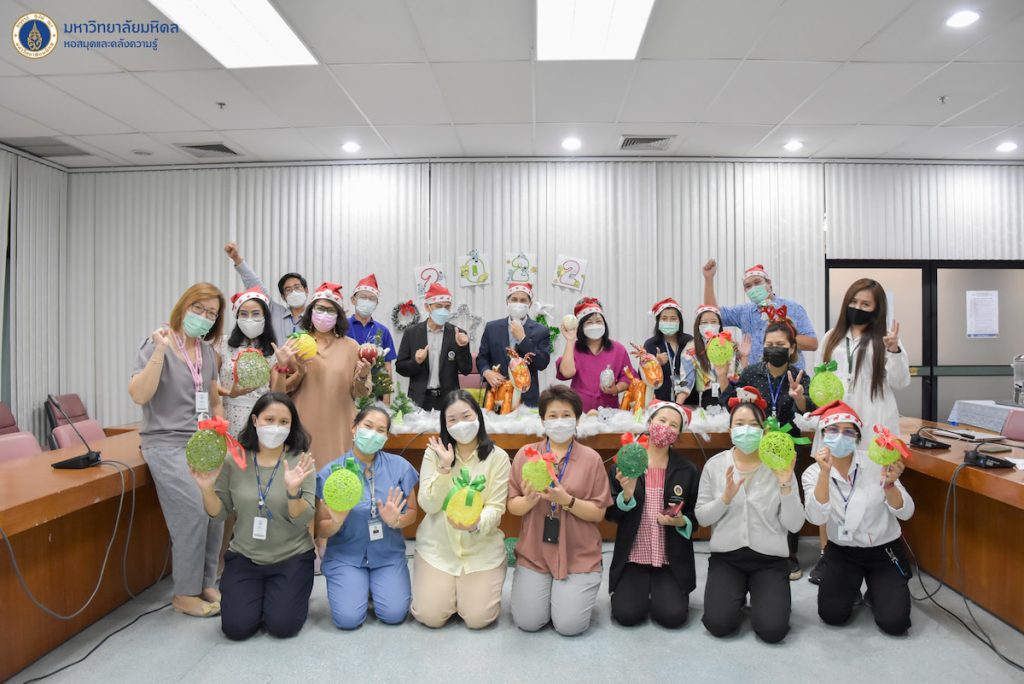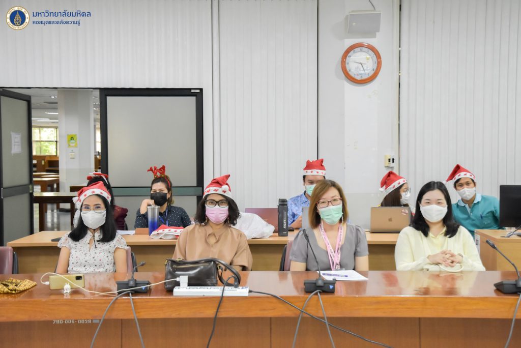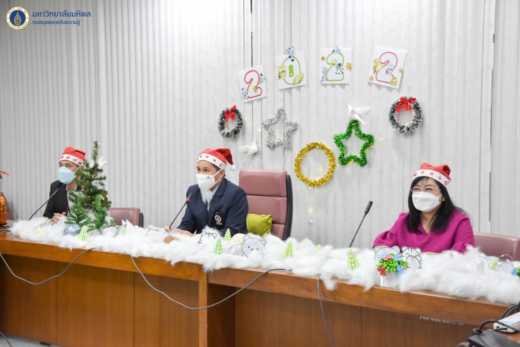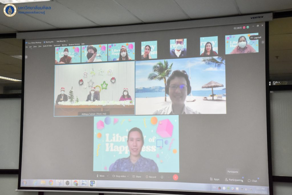 หอสมุดและคลังความรู้มหาวิทยาลัยมหิดล โดยคณะทำงานเสริมสร้างความสุของค์กรและทำนุบำรุงศิลปวัฒนธรรม หอสมุดและคลังความรู้มหาวิทยาลัยมหิดล ได้จัดกิจกรรม LIBRARY OF HAPPINESS เมื่อวันที่ 23 ธันวาคม 2564 เวลา 13.30 น . เป็นการส่งท้ายปีเก่าต้อนรับปีใหม่ 2565 มอบความสุขให้กับบุคลากร ได้รับเกียรติจาก ผู้ช่วยศาสตราจารย์ ดร.นพพล เผ่าสวัสดิ์ ผู้อำนวยการหอสมุดและคลังความรู้มหาวิทยาลัยมหิดล และทีมผู้บริหาร ประกอบด้วย นางอังคณา อินทรพาณิชย์ รองผู้อำนวยการฝ่ายบริหารและพัฒนาคุณภาพห้องสมุด ดร.อภิภู สิทธิภูมิมงคล รองผู้อำนวยการฝ่ายเทคโนโลยีการศึกษาและพันธกิจพิเศษ ผู้ช่วยศาสตราจารย์ ดร.ทัศนียา รัตนฤๅทัย นพรัตน์แจ่มจำรัส รองผู้อำนวยการฝ่ายวิจัยและวิชาการ ผู้ช่วยศาสตราจารย์ ดร.ประพัฒน์ สุริยผล รองผู้อำนวยการฝ่ายพัฒนาเทคโนโลยีสารสนเทศและนวัตกรรม พร้อมด้วยหัวหน้าห้องสมุดฯ หัวหน้าฝ่ายฯและหัวหน้างานฯ รวมถึงบุคลากร เข้าร่วมกิจกรรมทั้งทาง ONLINE และ ONSITE ภายในกิจกรรมดังกล่าว มีการจับฉลากของขวัญโดยใช้วงล้อนำโชคออนไลน์ (WHEEL OF FORTUNE )เพื่อส่งความสุขปีใหม่ให้กับบุคลากร ทุกคนให้ได้รับโชค กันอย่างสนุกสนาน ภายใต้การควบคุมตามมาตรการป้องกันการแพร่ระบาดของเชื้อไวรัสโคโรนา(COVID – 19)