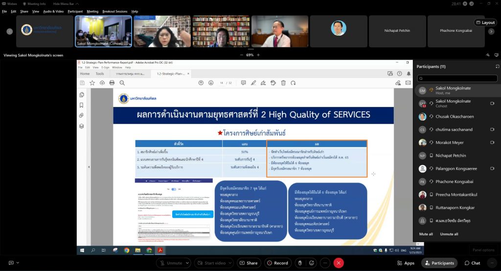 มไหสวริยะ อธิการบดีมหาวิทยาลัยมหิดล เป็นประธานกรรมการฯ และศาสตราจารย์ ดร.ชุติมา สัจจานันท์ ให้เกียรติเป็นกรรมการผู้ทรงคุณวุฒิ ร่วมกับคณะผู้บริหาร คณบดี และหัวหน้าส่วนงานต่าง ๆ ในมหาวิทยาลัยมหิดล ในการนี้ ผู้ช่วยศาสตราจารย์ ดร.นพพล เผ่าสวัสดิ์ ผู้อำนวยการหอสมุดและคลังความรู้ฯ คุณอังคณา อินทรพาณิชย์ รองผู้อำนวยการฝ่ายบริหารและพัฒนาคุณภาพห้องสมุด ดร.อภิภู สิทธิภูมิมงคล รองผู้อำนวยการฝ่ายเทคโนโลยีการศึกษาและพันธกิจพิเศษ และผู้ช่วยศาสตราจารย์ ดร.ประพัฒน์ สุริยผล รองผู้อำนวยการฝ่ายพัฒนาเทคโนโลยีสารสนเทศและนวัตกรรม เข้าร่วมการประชุมในครั้งนี้ เมื่อวันจันทร์ที่ 23 มกราคม 2566 ที่ผ่านมา ณ ห้องประชุม The Platoon ชั้น 1 อาคารหอสมุดและคลังความรู้มหาวิทยาลัยมหิดล ศาลายา และผ่านระบบประชุมออนไลน์ Cisco Webex Meeting