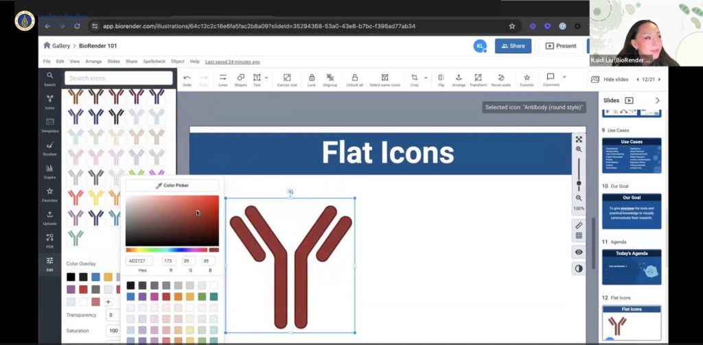 หอสมุดและคลังความรู้มหาวิทยาลัยมหิดล จัดการอบรมเชิงปฏิบัติการ BioRender 101: Getting Started @Mahidol University ขึ้นเมื่อวันพุธที่ 24 มกราคม 2567 ผ่านระบบออนไลน์ Zoom Meeting โดยได้รับเกียรติจาก Kaidi Liu, Science Communication & Customer Success Associate, BioRender เป็นวิทยากรบรรยายให้ความรู้ในครั้งนี้ ซึ่งมี อาจารย์ นักศึกษา และบุคลากรมหาวิทยาลัยมหิดลเข้ารับการอบรมจำนวน 95 ท่าน เพื่อเรียนรู้เทคนิคการออกแบบรูปภาพทางวิทยาศาสตร์ สำหรับ Poster, Presentations และ งานตีพิมพ์ สาธิตการใช้งาน BioRender เบื้องต้น และการใช้งาน Tools ต่าง ๆ ของ BioRender