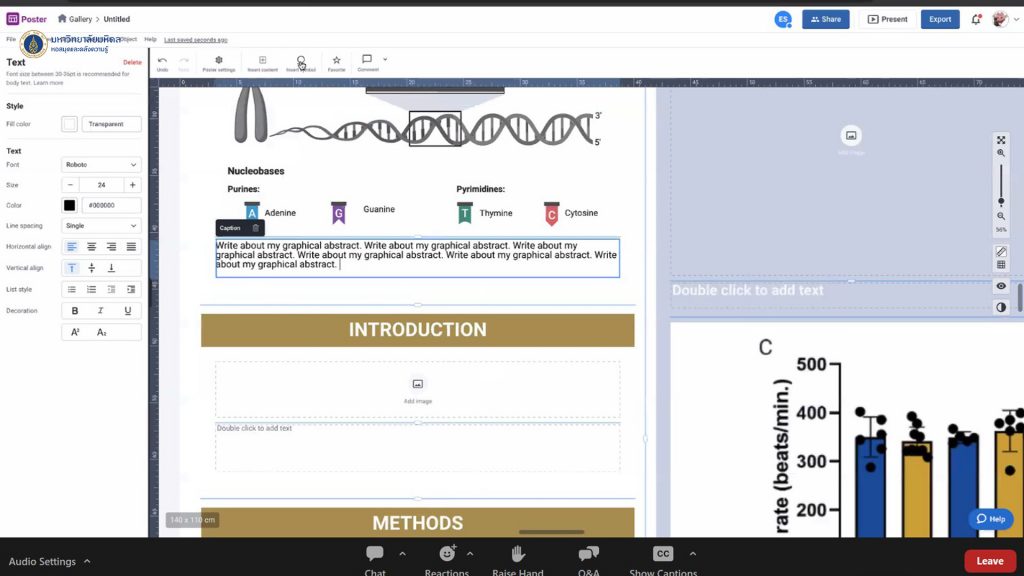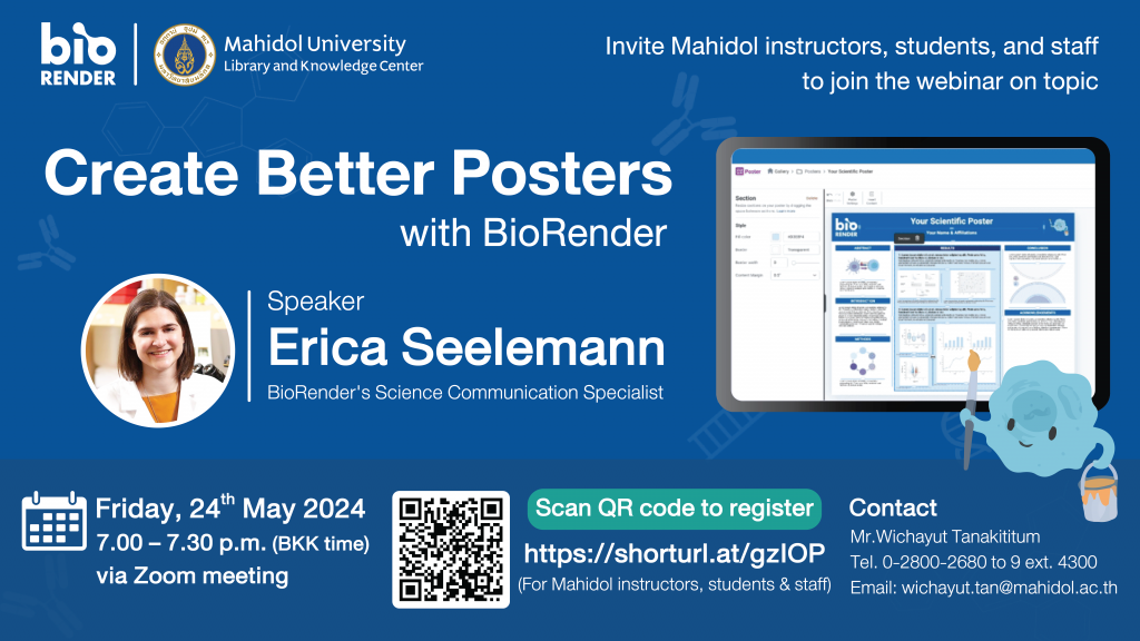 หอสมุดและคลังความรู้มหาวิทยาลัยมหิดล ร่วมกับบริษัท BioRender จัดการอบรมเชิงปฏิบัติการเรื่อง “Create Better Posters with BioRender” โดยมี Miss Erica Seelemann, Science Communication Specialist จากบริษัท BioRenderเป็นวิทยากรบรรยายให้ความรู้ในครั้งนี้ ในวันศุกร์ที่ 24 พฤษภาคม พ.ศ. 2567 ในรูปแบบออนไลน์ผ่านระบบZoom Meeting ซึ่งการอบรมในครั้งนี้เปิดโอกาสให้นักศึกษา อาจารย์ นักวิจัย และบุคลากรมหาวิทยาลัยมหิดล ได้แลกเปลี่ยนเรียนรู้วิธีการใช้งานโปรแกรมBioRenderเพื่อสร้างสรรค์สื่อวิชาการด้านวิทยาศาสตร์อย่างมีประสิทธิภาพ