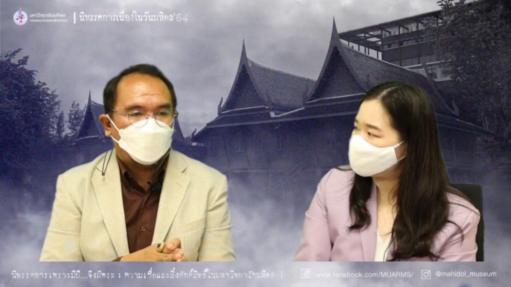วันศุกร์ที่ 24 กันยายน 2564 ฝ่ายจดหมายเหตุและพิพิธภัณฑ์ หอสมุดและคลังความรู้มหาวิทยาลัยมหิดล ได้จัดนิทรรศการเนื่องในวันมหิดล เรื่อง “เพราะมีผี…จึงมีพระ” : ความเชื่อและสิ่งศักดิ์สิทธิ์ในมหาวิทยาลัยมหิดล เผยแพร่ทางออนไลน์ผ่านระบบ Facebook Live โดยมี ผู้ช่วยศาสตราจารย์ ดร.นพพล เผ่าสวัสดิ์ ผู้อำนวยการหอสมุดและคลังความรู้มหาวิทยาลัยมหิดล เป็นประธานกล่าวเปิดนิทรรศการฯ พร้อมกล่าวต้อนรับวิทยากร ซึ่งได้รับเกียรติจาก ผู้ช่วยศาสตราจารย์ ดร.อภิลักษณ์ เกษมผลกูล คณะศิลปศาสตร์ มหาวิทยาลัยมหิดล เป็นวิทยากรในการบรรยาย นอกจากนี้ภายในนิทรรศการยังได้จัดกิจกรรมสนทนาในหัวข้อ “ล้อมวงเล่าผี คืน 24 กันยา” ขึ้น ผ่าน Application : Clubhouse อีกด้วย
