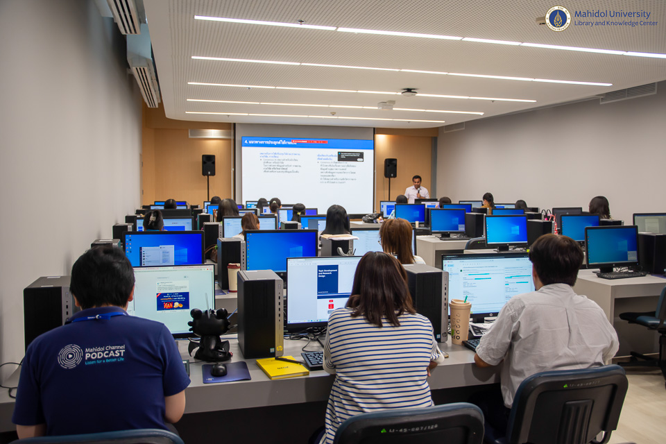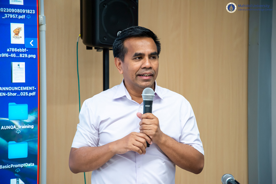 หอสมุดและคลังความรู้มหาวิทยาลัยมหิดล จัดอบรม Research Writing & Publication Support ภายใต้โครงการ AI Skill raise-up for Research assistant: ยกระดับทักษะปัญญาประดิษฐ์สำหรับผู้ช่วยการวิจัย โดยมี ผู้ช่วยศาสตราจารย์ ดร.ทวีศักดิ์ สมานชื่น รองผู้อำนวยการฝ่ายเทคโนโลยีดิจิทัล เป็นวิทยากรบรรยาย ในวันพุธที่ 24 กันยายน พ.ศ. 2568 ณ ห้องอบรมคอมพิวเตอร์ ชั้น 2 อาคารหอสมุดและคลังความรู้ฯ เพื่อเรียนรู้การแนวทางการประยุกต์ใช้เทคโนโลยี AI เพื่อช่วยปรับปรุงและพัฒนาการทำผลงานวิจัยของบุคลากรหอสมุดและคลังความรู้ฯ อย่างมีประสิทธิภาพ