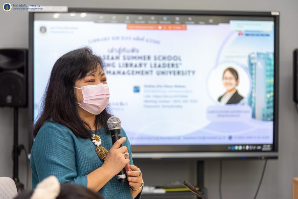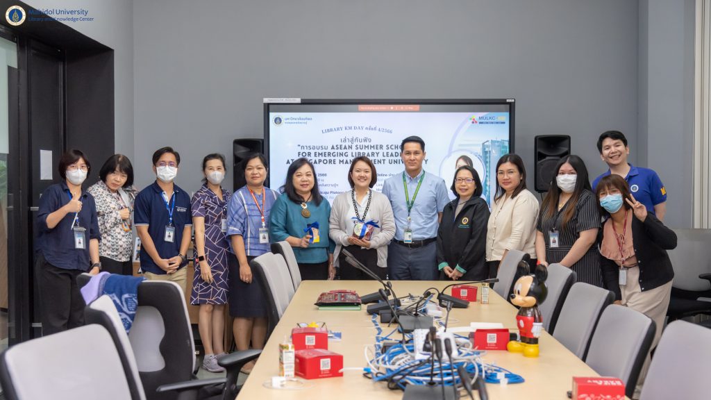 หอสมุดและคลังความรู้มหาวิทยาลัยมหิดล โดย คุณอังคณา อินทรพาณิชย์ รองผู้อำนวยการฝ่ายบริหารและพัฒนาคุณภาพห้องสมุด และประธานคณะกรรมการ Digital KM Masterclass และการจัดการความรู้ หอสมุดและคลังความรู้มหาวิทยาลัยมหิดล เป็นประธานกล่าวเปิดกิจกรรม LIBRARY KM DAY ครั้งที่ 4 ประจำปี 2566 ในหัวข้อ เล่าสู่กันฟัง “การอบรม ASEAN Summer School for Emerging Library Leaders” at Singapore Management University ในโอกาสนี้ ผู้ช่วยศาสตราจารย์ ดร.นพพล เผ่าสวัสดิ์ ผู้อำนวยการหอสมุดและคลังความรู้ ให้เกียรติร่วมรับฟังการบรรยายในครั้งนี้ โดยมีคุณวราภรณ์ เหล่านิติศาสตร์ นักเอกสารสนเทศ จากงานพัฒนาทรัพยากรวารสาร ฝ่ายเทคนิคห้องสมุด หอสมุดและคลังความรู้มหาวิทยาลัยมหิดล เป็นวิทยากรร่วมแลกเปลี่ยนเรียนรู้ประสบการณ์การทำงาน เมื่อวันศุกร์ที่ 25 สิงหาคม 2566 ที่ผ่านมา เวลา 09.30-11.30 น. ณ ห้อง The Platoon ชั้น 1 อาคารหอสมุดและคลังความรู้มหาวิทยาลัยมหิดล ศาลายา และผ่านระบบประชุมออนไลน์ Cisco WebEx Meeting ซึ่งมีผู้เข้าร่วมกิจกรรมในครั้งนี้ แบบออนไซต์ 18 คน แบบออนไลน์ 65 คน รวมทั้งสิ้น 83 คน โดยมีวัตถุประสงค์เพื่อแบ่งปันประสบการณ์การศึกษาดูงาน ฝึกอบรม ณ ต่างประเทศ