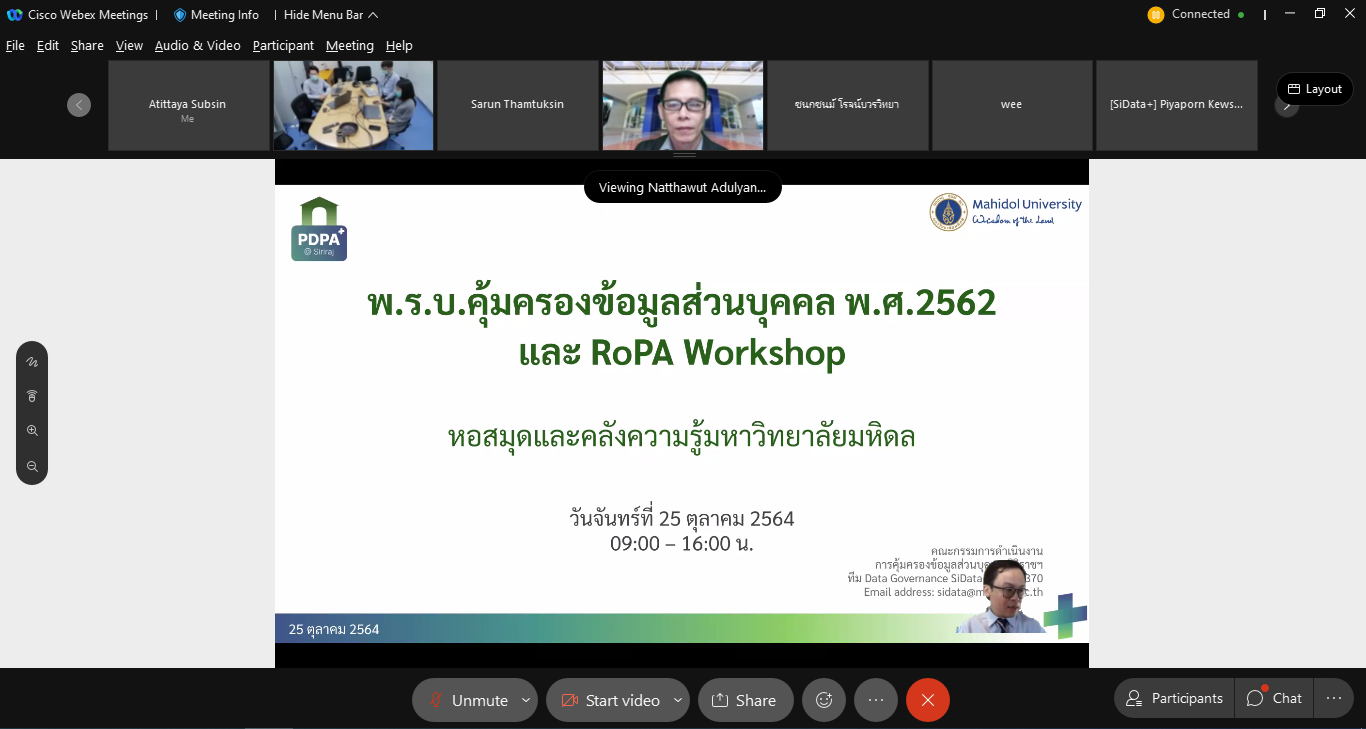 วันจันทร์ที่ 25 ตุลาคม 2564 เวลา 9.00 น. – 16.30 น. ดร.อภิภู สิทธิภูมิมงคล รองผู้อำนวยการฝ่ายเทคโนโลยีการศึกษาและพันธกิจพิเศษ หอสมุดและคลังความรู้มหาวิทยาลัยมหิดล เป็นประธานกล่าวเปิดการสัมมนาเชิงปฏิบัติการ เรื่อง พรบ.คุ้มครองข้อมูลส่วนบุคคล พ.ศ. 2562 ผ่านโปรแกรม Cisco WebEx โดยได้รับเกียรติจาก คุณณัฐวุฒิ อดุลยานุโกศล รองผู้อำนวยการศูนย์สารสนเทศและนวัตกรรมข้อมูลศิริราช (SiData+) เป็นวิทยากรบรรยายให้ความรู้ในหัวข้อ พรบ.คุ้มครองข้อมูลส่วนบุคคล พ.ศ. 2562 การวิเคราะห์ข้อมูลส่วนบุคคล และการจัดทำ RoPA ในช่วงบ่ายได้รับเกียรติจาก คุณวิเชียร บุญญะประภา หัวหน้าทีม Data Governance (SiData+) คุณวิสรุต โพธิ์ศรี และคุณปิย์ญาพร กิวสันเที๊ยะ ทีม Data Governance (SiData+) เป็นวิทยากรนำกิจกรรม Workshop  เพื่อเตรียมความพร้อมในโครงการ “สร้างความรู้ความเข้าใจและเตรียมความพร้อมเพื่อให้การดำเนินงานของหอสมุดและคลังความรู้มหาวิทยาลัยมหิดลเป็นไปตามพระราชบัญญัติข้อมูลส่วนบุคคล พ.ศ. 2562”