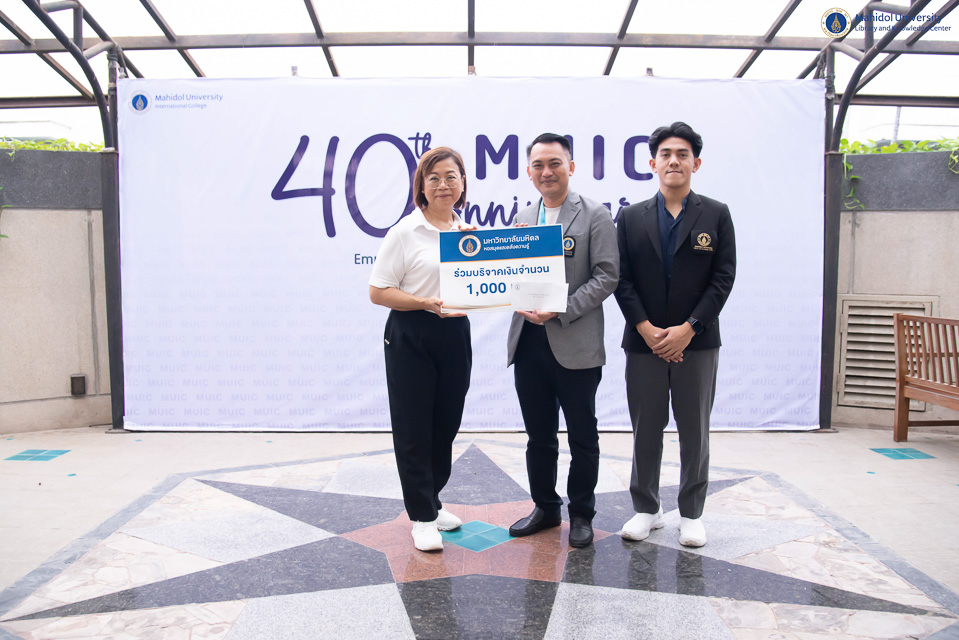 หอสมุดและคลังความรู้มหาวิทยาลัยมหิดล โดย อาจารย์ ดร.เอกชัย วารินศิริรักษ์ รองผู้อำนวยการฝ่ายนวัตกรรมบริการห้องสมุด ร่วมแสดงความยินดีเนื่องในโอกาสวันคล้ายวันสถาปนาวิทยาลัยนานาชาติ มหาวิทยาลัยมหิดล ครบรอบ 40 ปี โดยร่วมมอบเงินบริจาคจำนวน 1,000 บาท ให้กับ ศาสตราจารย์ แพทย์หญิงจุฬธิดา โฉมฉาย คณบดีวิทยาลัยนานาชาติ มหาวิทยาลัยมหิดล ในวันพฤหัสบดีที่ 26 มีนาคม พ.ศ. 2569 ณ อาคาร 1 วิทยาลัยนานาชาติ มหาวิทยาลัยมหิดล (ศาลายา)