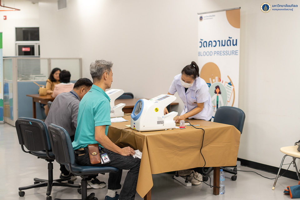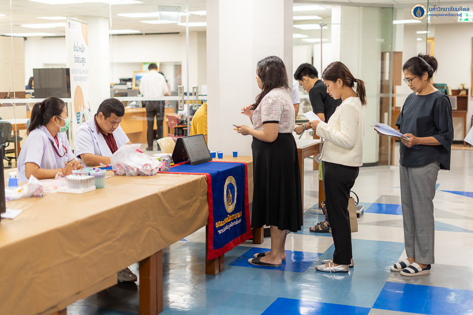 หอสมุดและคลังความรู้มหาวิทยาลัยมหิดล ได้ตระหนักถึงความสำคัญด้านสุขภาพของบุคลากร จึงได้จัดบริการตรวจประเมินสุขภาพประจำปี 2567 ให้กับบุคลากรขึ้น โดยคณะเทคนิคการแพทย์ มหาวิทยาลัยมหิดล เป็นผู้ให้บริการ เจาะเลือด วัดความดัน และ X-ray เป็นต้น ในวันอังคารที่ 26 พฤศจิกายน พ.ศ. 2567 ณ บริเวณ ชั้น 3 อาคารหอสมุดและคลังความรู้มหาวิทยาลัยมหิดล ศาลายา เพื่อส่งเสริมให้บุคลากรของหอสมุดและคลังความรู้ฯ มีสุขภาพร่างกาย สุขภาพใจ ที่แข็งแรง ปราศจากโรคภัยไข้เจ็บ ซึ่งจะนำพาองค์กรไปสู่ความเป็นเลิศได้อย่างยั่งยืนต่อไป