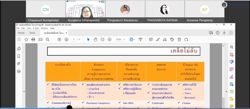 หอสมุดและคลังความรู้มหาวิทยาลัยมหิดล โดย ผู้ช่วยศาสตราจารย์ ดร.นพพล เผ่าสวัสดิ์ ผู้อำนวยการหอสมุดและคลังความรู้ฯ ได้เป็นประธานกล่าวเปิดการสัมมนาเชิงปฏิบัติการเพื่อพัฒนาศักยภาพบุคลากร เรื่อง กลเม็ดเคล็ดไม่ลับ ในการก้าวสู่ตำแหน่งที่สูงขึ้น ซึ่งโครงการฯนี้ จัดขึ้นโดยผู้ช่วยศาสตราจารย์ ดร. ทัศนียา รัตนฤาทัย นพรัตน์แจ่มจำรัส รองผู้อำนวยการฝ่ายวิจัยและวิชาการ และคณะทำงาน มีวัตถุประสงค์ที่จะทำให้บุคลากรมีความรู้ ความเข้าใจเกี่ยวกับการขอตำแหน่งที่สูงขึ้นของบุคลากรสายสนับสนุน และสร้างความเข้าใจในกระบวนการจัดทำผลงาน ส่งผลให้เกิดแรงจูงใจ นำไปสู่การทำผลงานได้สำเร็จ บรรลุผลตามวัตถุประสงค์ และมีวิทยากรผู้ทรงคุณวุฒิมาให้ความรู้จำนวน 2 ท่าน คือ คุณอังคณา อินทรพาณิชย์ รองผู้อำนวยการฝ่ายบริหารและพัฒนาคุณภาพห้องสมุด และคุณโสมรัศมิ์ พิบูลย์มณี บรรณารักษ์(ผู้ชำนาญการพิเศษ) ในวันที่ 27 เมษายน 2565 ที่ผ่านมา ผ่านระบบโปรแกรมออนไลน์ Cisco Webex Meeting