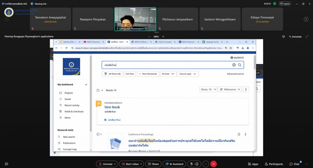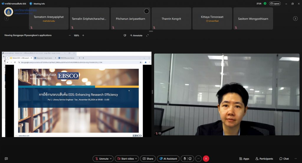 หอสมุดและคลังความรู้มหาวิทยาลัยมหิดล โดย งานพัฒนาทรัพยากรวารสาร จัดการอบรมในหัวข้อ “การใช้งานระบบสืบค้น EBSCO Discovery Service (EDS)” ในวันพุธที่ 27 พฤศจิกายน พ.ศ. 2567 ณ ห้องประชุม 2 ชั้น 3 อาคารหอสมุดและคลังความรู้ฯ และในรูปแบบออนไลน์ผ่านระบบ Cisco Webex Meeting โดยได้รับเกียรติจากคุณนันทรัตน์ นนทิวัฒน์วณิช จากบริษัท EBSCO เป็นวิทยากรบรรยายแนะนำเทคนิคการใช้ระบบ New EDS UI ในการสืบค้นทรัพยากรสารสนเทศให้มีประสิทธิภาพ และการใช้ปัญญาประดิษฐ์ในงานวิจัยด้วย AI Insight โดยมีบุคลากรหอสมุดและคลังความรู้ฯ เข้ารับการอบรมทั้งสิ้น 50 คน
