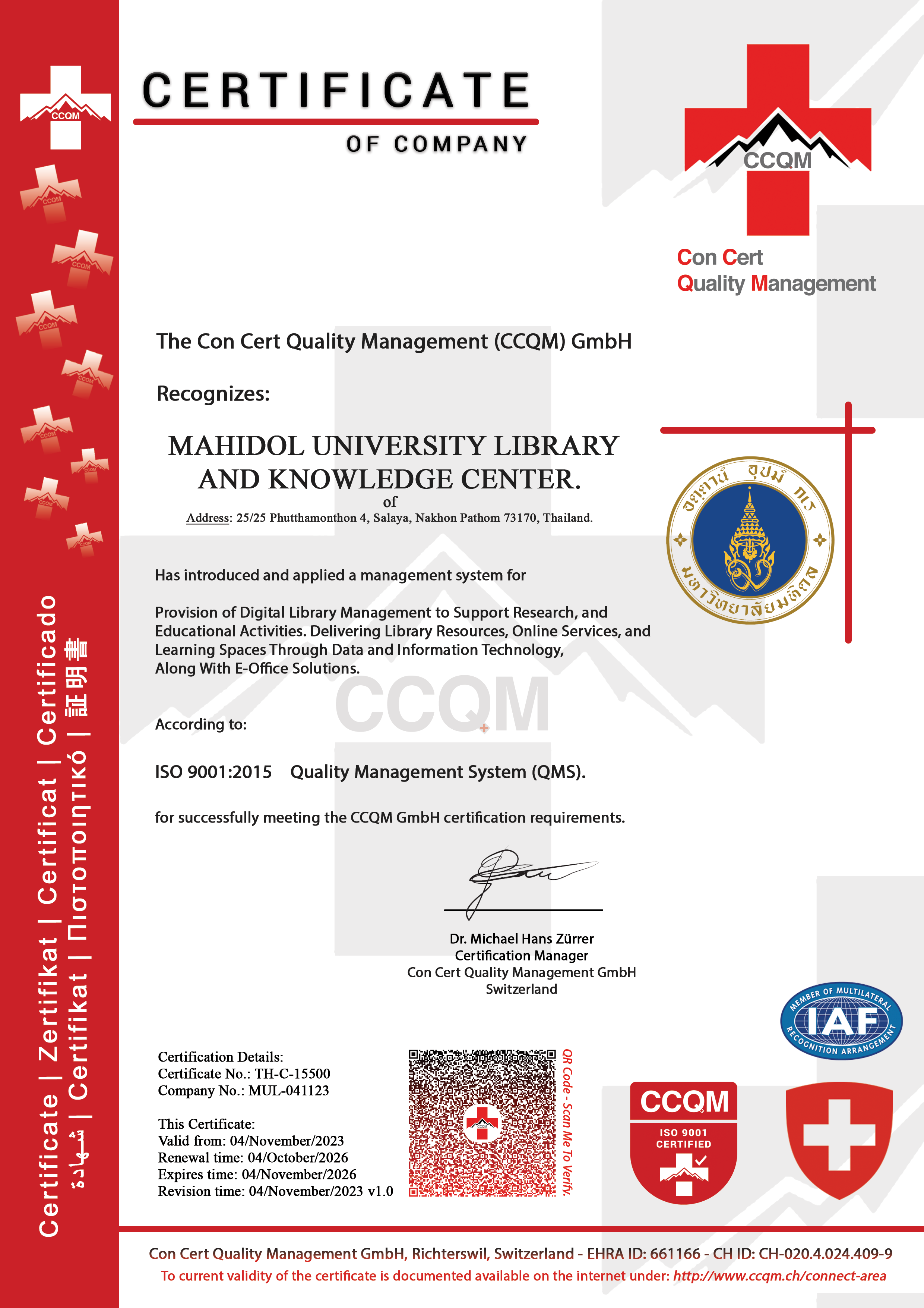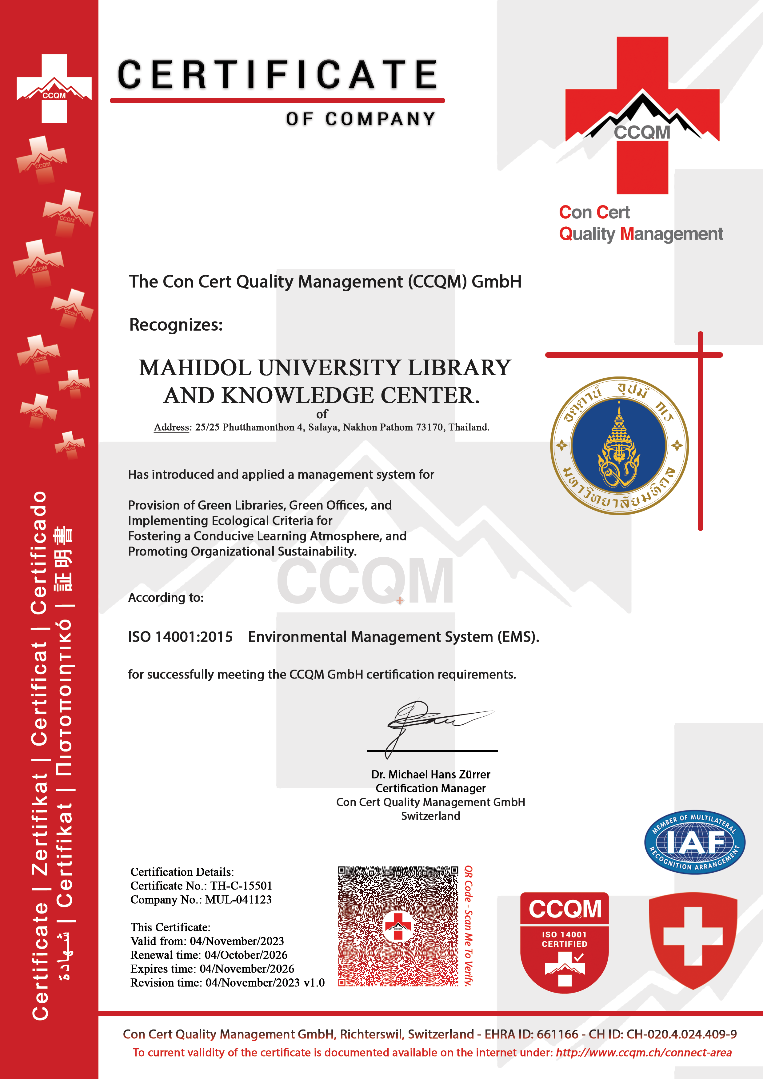ในโอกาสนี้หอสมุดและคลังความรู้ฯ ได้ผ่านการรับรองตามระบบมาตรฐานการบริหารงานคุณภาพ ISO 9001:2015 และมาตรฐานการจัดการด้านสิ่งแวดล้อม ISO 14001:2015 อย่างเป็นทางการ เมื่อวันที่ 4 พฤศจิกายน 2566 และจะนำข้อเสนอแนะโดยคณะกรรมการตรวจประเมินฯ มาปรับปรุงและพัฒนาระบบมาตรฐานฯ ของหอสมุดและคลังความรู้ฯ ให้ดียิ่งขึ้นต่อไปในอนาคต
