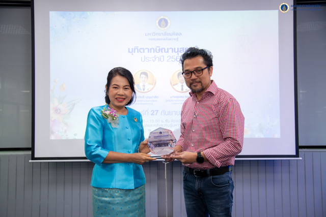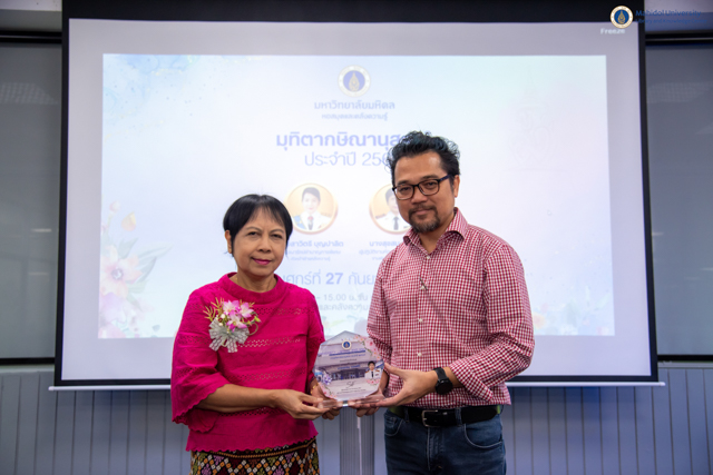 หอสมุดและคลังความรู้มหาวิทยาลัยมหิดล โดย ผู้ช่วยศาสตราจารย์ ดร.สราวุธ เวชกิจ ผู้อำนวยการหอสมุดและคลังความรู้ฯ เป็นประธานกล่าวเปิดกิจกรรมมุทิตากษิณานุสรณ์ ประจำปี 2567 และมอบของที่ระลึกแด่บุคลากรผู้เกษียณอายุราชการของหอสมุดและคลังความรู้ฯ ในวันศุกร์ที่ 27 กันยายน พ.ศ. 2567 ซึ่งในปีนี้มีบุคลากรผู้เกษียณอายุราชการฯ จำนวน 2 ท่าน ได้แก่ คุณสาวิตรี บุญปาลิต บรรณารักษ์ผู้ชำนาญการพิเศษ งานเผยแพร่ผลงานวิชาการของมหาวิทยาลัย และคุณสุขสม ทองศิริ ผู้ปฏิบัติงานห้องสมุด (ผู้ชำนาญงาน) งานพัฒนาทรัพยากรวารสาร ณ ห้องประชุม 1 ชั้น 3 อาคารหอสมุดและคลังความรู้ฯ ศาลายา เพื่อร่วมแสดงมุทิตาจิตและยกย่องเชิดชูเกียรติ คุณงามความดีของผู้เกษียณอายุราชการที่ได้ตั้งใจปฏิบัติงาน ด้วยความวิริยะอุตสาหะตลอดมา ในโอกาสนี้ บุคลากรผู้เกษียณอายุราชการ เดินทางไปสักการะสิ่งศักดิ์สิทธิ์ประจำมหาวิทยาลัยมหิดล ได้แก่ พระพุทธมหิดลมงคลปัญญาญาณ พระราชานุสาวรีย์ สมเด็จพระมหิตลาธิเบศร อดุลยเดชวิกรม พระบรมราชชนก และศาลพ่อขุนทุ่ง เพื่อเป็นสิริมงคลแก่ชีวิตสืบไป
