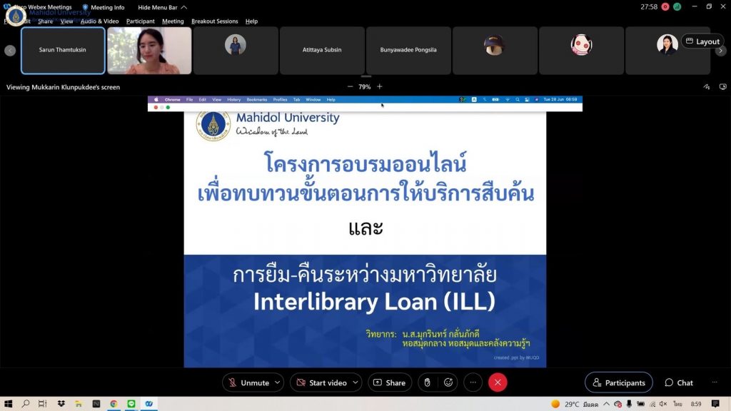 หอสมุดและคลังความรู้มหาวิทยาลัยมหิดล โดย ผู้ช่วยศาสตราจารย์ ดร.นพพล เผ่าสวัสดิ์ ผู้อำนวยการหอสมุดลคลังความรู้ฯ ได้เป็นประธานกล่าวเปิดการโครงการตามแผนยุทธศาสตร์หอสมุดและคลังความรู้มหาวิทยาลัยมหิดล เรื่อง การจัดอบรมออนไลน์เพื่อทบทวนขั้นตอนการให้บริการสืบค้น และการยืม-คืนระหว่างมหาวิทยาลัย (Interlibrary Loan) โดย คุณมุกรินทร์ กลั่นภักดี นักเอกสารสนเทศ หอสมุดกลาง เป็นวิทยากร ผ่านระบบ Cisco Webex Meeting เมื่อวันที่ 28 มิถุนายน 2565 ที่ผ่านมา