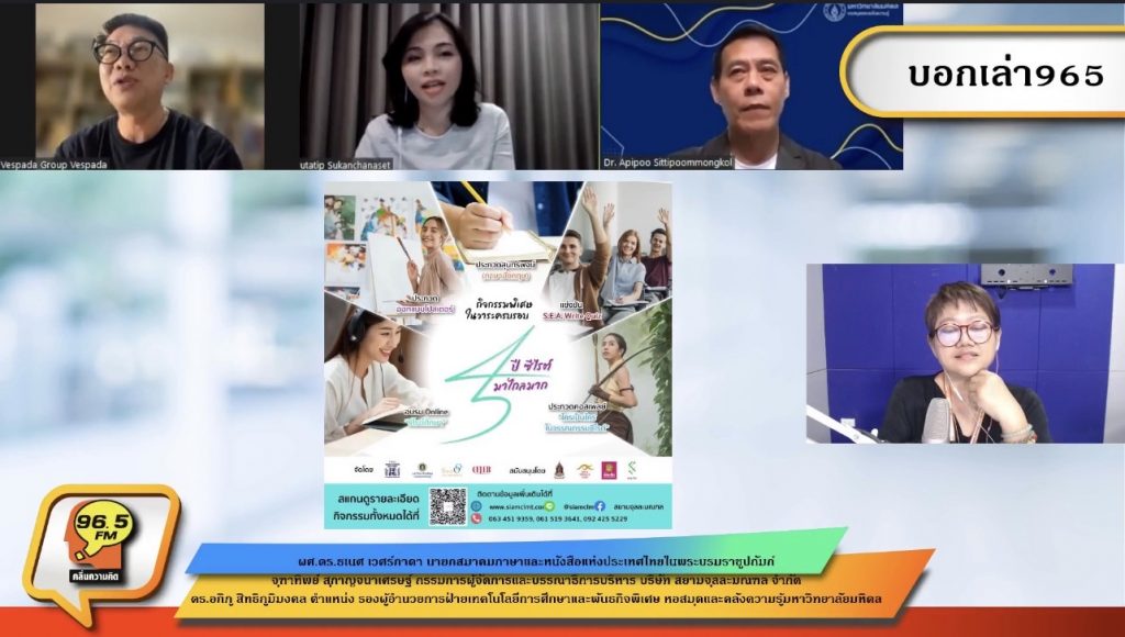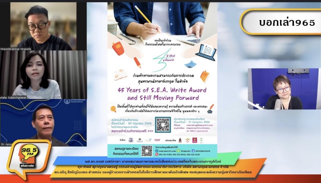 หอสมุดและคลังความรู้มหาวิทยาลัยมหิดล โดย ดร.อภิภู สิทธิภูมิมงคล รองผู้อำนวยการฝ่ายเทคโนโลยีการศึกษาและพันธกิจพิเศษ ได้รับเกียรติเป็นผู้ร่วมดำเนินรายการสด บอกเล่า 965 ในประเด็นเรื่อง “45 ปี ซีไรต์มาไกลมาก” ร่วมกับ ผู้ช่วยศาสตราจารย์ ดร.ธเนศ เวศร์ภาดา นายกสมาคมภาษาและหนังสือแห่งประเทศไทยในพระบรมราชูปถัมภ์ และคุณจุฑาทิพย์ สุกาญจนาเศรษฐ์ กรรมการผู้จัดการบริษัท สยามจุลละมณฑล จำกัด เผยแพร่ผ่านทางสถานีวิทยุคลื่น FM 96.5 เมกะเฮิรตซ์ คลื่นความคิด และผ่านทาง Facebook Live FM 96.5 โดยมีวัตถุประสงค์เพื่อแลกเปลี่ยนและเล่าถึงวัตถุประสงค์ของการจัดทำ MOU ร่วมกัน ระหว่างหอสมุดและคลังความรู้มหาวิทยาลัยมหิดล บริษัท สยามจุลละมณฑล จำกัด และสมาคมภาษาและหนังสือแห่งประเทศไทยในพระบรมราชูปถัมภ์ และนำเสนอกิจกรรมที่จะเกิดขึ้นในอนาคต ปลุกกระแสแวดวงวรรณกรรมไทยและอาเซียนให้กลับมาได้รับความสนใจอีกครั้ง พร้อมดึงเยาวชนและนักอ่านรุ่นใหม่ให้สร้างงานเขียนและการอ่านอย่างมีคุณค่า เพื่อพัฒนาศักยภาพพัฒนาความคิดและการเติบโตทางสังคมต่อไปในอนาคต