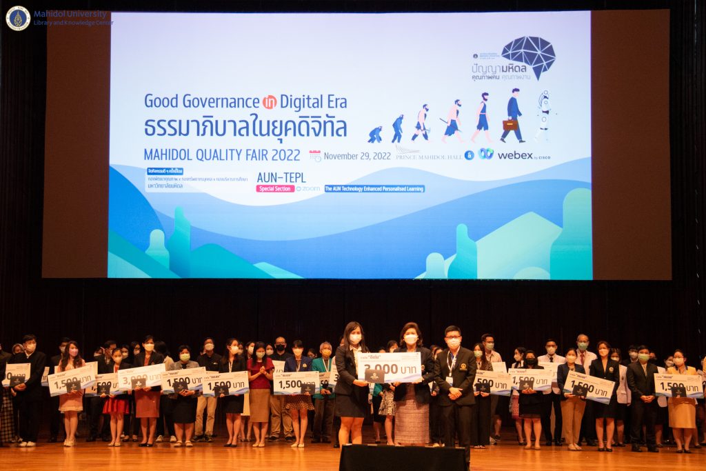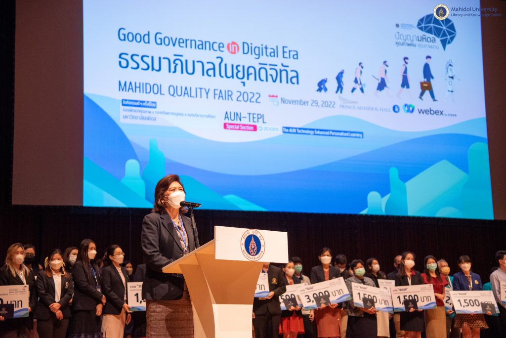 มหาวิทยาลัยมหิดล โดย รองศาสตราจารย์ ดร. ภญ.จุฑามณี สุทธิสีสังข์ รองอธิการบดีมหาวิทยาลัยมหิดล ได้ให้เกียรติเป็นประธานกล่าวเปิดงานมหกรรมคุณภาพมหาวิทยาลัยมหิดล ประจำปี 2565 Mahidol Quality Fair 2022 และมอบรางวัลพร้อมประกาศเกียรติคุณ โดยมีคุณอังคณา อินทรพาณิชย์ รองผู้อำนวยการฝ่ายบริหารและพัฒนาคุณภาพห้องสมุด ร่วมงานในครั้งนี้ ในการนี้หอสมุดและคลังความรู้ฯ ได้ส่งโปสเตอร์นำเสนอ จำนวน 2 รายการ ได้แก่ โครงการส่งเสริมการเข้าถึงผลงานวิชาการของมหาวิทยาลัยมหิดลด้วยสื่อวีดิทัศน์ (The Author) โดยคุณนภัสวรรณ สุพัตร หัวหน้างานเทคโนโลยีการศึกษา และคุณปรเมศวร์ รังสีสุริยันต์ นักวิเทศสัมพันธ์ งานบริหารและธุรการ หอสมุดและคลังความรู้มหาวิทยาลัยมหิดล ซึ่งได้ร่วมจัดแสดงโครงการในครั้งนี้ ณ มหิดลสิทธาคาร ชั้น 1 และโครงการ วินวิน พี่ได้น้องได้ โครงการนักศึกษาช่วยงานคลังสารสนเทศสถาบันของมหาวิทยาลัยมหิดล (Mahidol IR) โดยคุณสาวิตรี บุญปาลิต หัวหน้าฝ่ายคลังความรู้ คุณทิพย์สุดา วนะวนานนท์ หัวหน้างานเผยแพร่ผลงานวิชาการของมหาวิทยาลัย และคุณชญานิษฐ์ นิยม บรรณารักษ์ งานเผยแพร่ผลงานวิชาการของมหาวิทยาลัย ซึ่งได้ร่วมจัดแสดงโครงการในครั้งนี้ผ่านระบบออนไลน์ Digital KM Masterclass