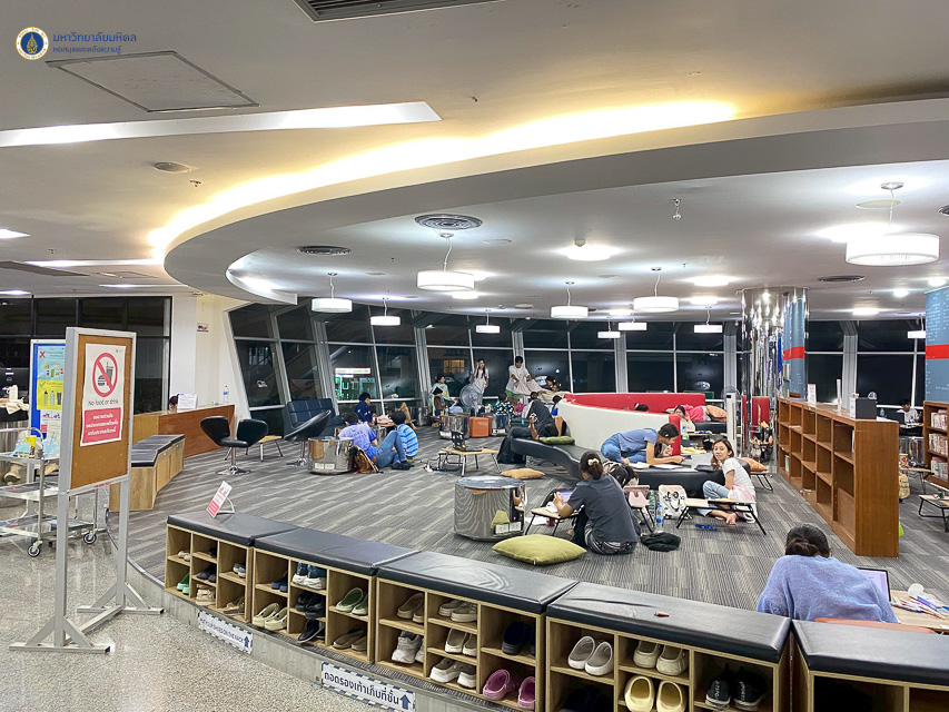 หอสมุดและคลังความรู้มหาวิทยาลัยมหิดล เปิดให้บริการพื้นที่นั่งอ่านหนังสือตลอด 24 ชั่วโมง สำหรับนักศึกษามหาวิทยาลัยมหิดล ในช่วงสอบปลายภาค ณ บริเวณพื้นที่อ่านหนังสือ Relaxing Zone, Co-MU Space และโซน e-Lecture ชั้น 1 อาคารหอสมุดและคลังความรู้ฯ เป็นระยะเวลา 10 วัน ตั้งแต่วันที่ 23-30 เมษายน พ.ศ. 2568 โดยมีนักศึกษา อาจารย์ และบุคลากรของมหาวิทยาลัยมหิดล เข้าใช้บริการรวมทั้งสิ้นจำนวน 3,543 คน ทั้งนี้ หอสมุดและคลังความรู้ฯ ได้จัดสิ่งอำนวยความสะดวกและความปลอดภัยให้กับผู้ใช้บริการ พร้อมทั้งจัดอาหาร ขนมขบเคี้ยว และเครื่องดื่มสำหรับให้บริการ โดยได้รับการสนับสนุนจากบริษัท บริษัท นิว โนวเลจ อินฟอร์มเมชั่น จํากัด, Cambridge University Press, Wiley Online Library, SpringerNature, Globe Publication รวมถึงบุคลากรหอสมุดและคลังความรู้ฯ คณาจารย์มหาวิทยาลัยมหิดล และประชาชนทั่วไป