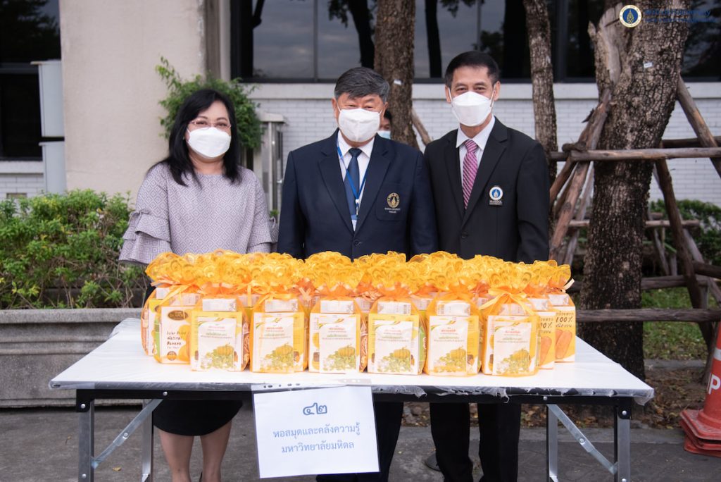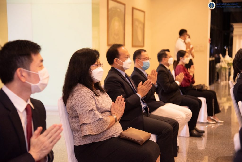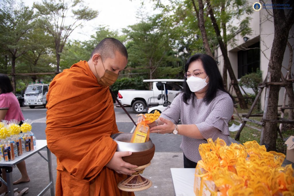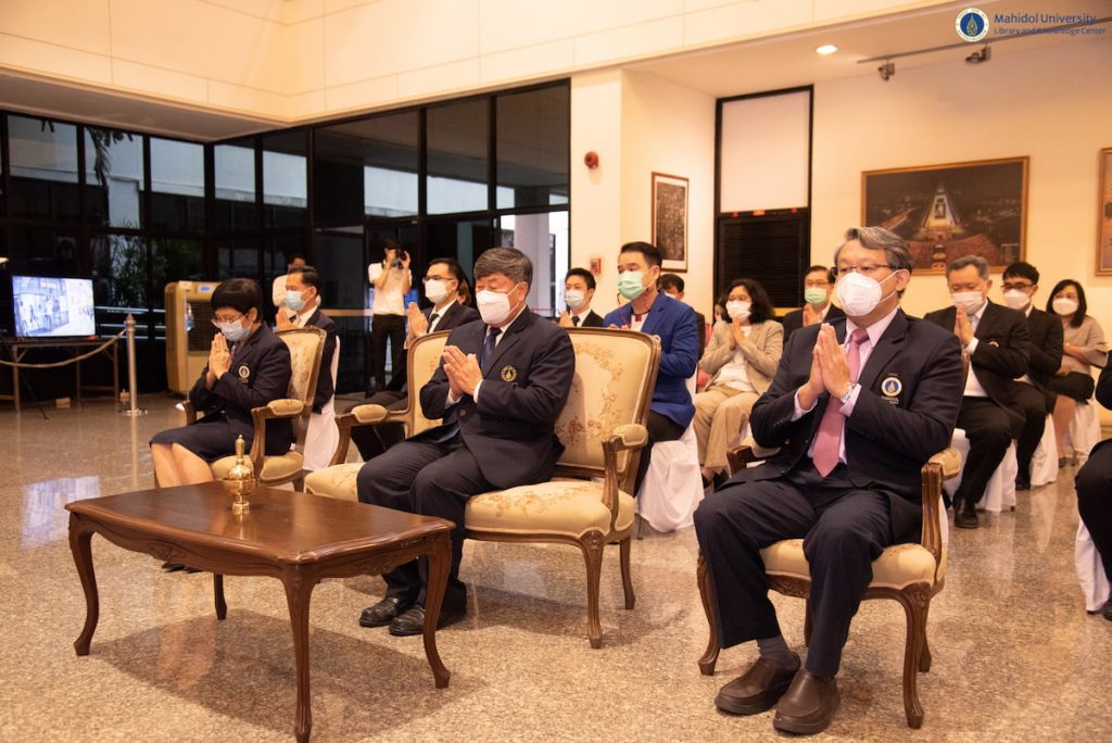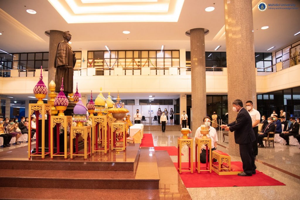 หอสมุดและคลังความรู้มหาวิทยาลัยมหิดล โดย คุณอังคณา อินทรพาณิชย์ รองผู้อำนวยการฝ่ายบริหารและพัฒนาคุณภาพห้องสมุด และดร.อภิภู สิทธิภูมิมงคล รองผู้อำนวยการฝ่ายเทคโนโลยีการศึกษาและพันธกิจพิเศษ ร่วมพิธีทำบุญตักบาตรพระสงฆ์ สามเณร จำนวน 30 รูป และร่วมพิธีเจริญพระพุทธมนต์ ณ โถงพระรูปสมเด็จพระมหิตลาธิเบศรอดุลยเดชวิกรม พระบรมราชชนก สำนักงานอธิการบดี มหาวิทยาลัยมหิดล ศาลายา เนื่องในวาระดิถีขึ้นปีใหม่ ประจำปีพุทธศักราช 2565 ในวันพฤหัสบดีที่ 30 ธันวาคม 2564 ตั้งแต่เวลา 06.30 น. โดยมีศาสตราจารย์ นายแพทย์บรรจง มไหสวริยะ อธิการบดีมหาวิทยาลัยมหิดล เป็นประธานในพิธี พร้อมด้วยคณะผู้บริหารมหาวิทยาลัยมหิดลและคณบดีทุกส่วนงานเข้าร่วมพิธีโดยพร้อมเพรียงกัน