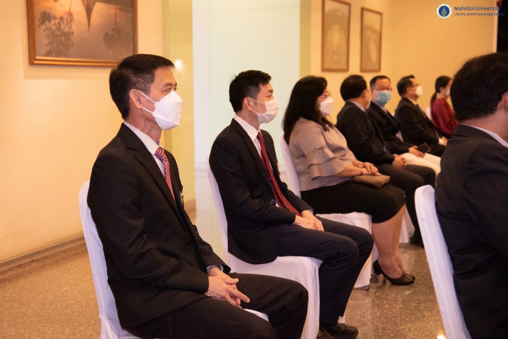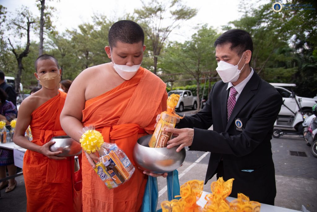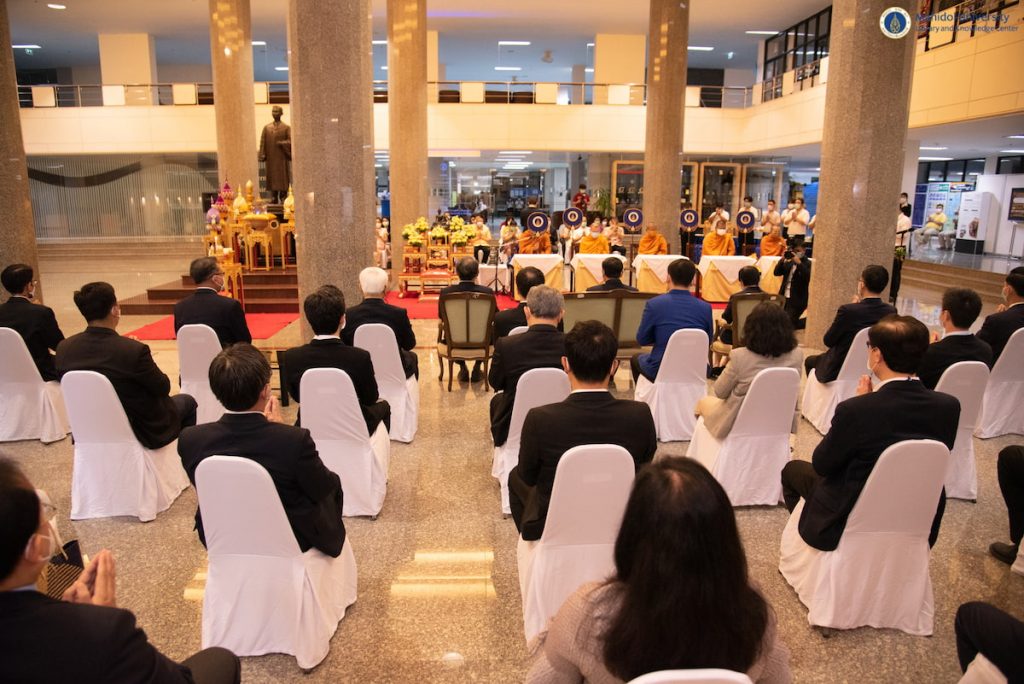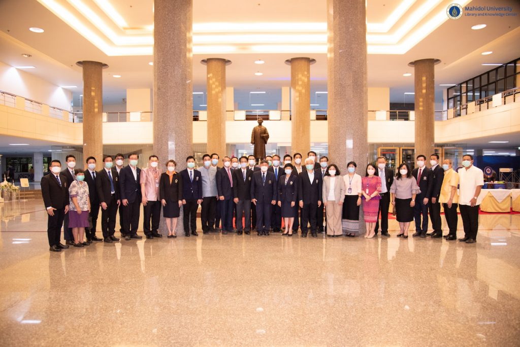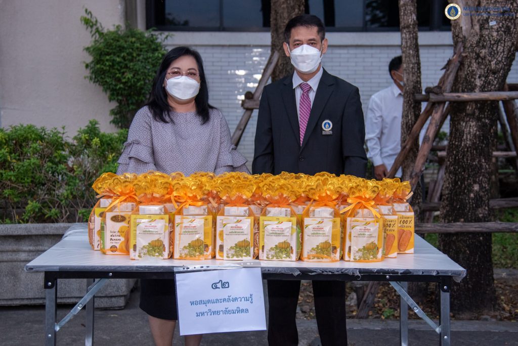 หอสมุดและคลังความรู้มหาวิทยาลัยมหิดล โดย คุณอังคณา อินทรพาณิชย์ รองผู้อำนวยการฝ่ายบริหารและพัฒนาคุณภาพห้องสมุด และดร.อภิภู สิทธิภูมิมงคล รองผู้อำนวยการฝ่ายเทคโนโลยีการศึกษาและพันธกิจพิเศษ ร่วมพิธีทำบุญตักบาตรพระสงฆ์ สามเณร จำนวน 30 รูป และร่วมพิธีเจริญพระพุทธมนต์ ณ โถงพระรูปสมเด็จพระมหิตลาธิเบศรอดุลยเดชวิกรม พระบรมราชชนก สำนักงานอธิการบดี มหาวิทยาลัยมหิดล ศาลายา เนื่องในวาระดิถีขึ้นปีใหม่ ประจำปีพุทธศักราช 2565 ในวันพฤหัสบดีที่ 30 ธันวาคม 2564 ตั้งแต่เวลา 06.30 น. โดยมีศาสตราจารย์ นายแพทย์บรรจง มไหสวริยะ อธิการบดีมหาวิทยาลัยมหิดล เป็นประธานในพิธี พร้อมด้วยคณะผู้บริหารมหาวิทยาลัยมหิดลและคณบดีทุกส่วนงานเข้าร่วมพิธีโดยพร้อมเพรียงกัน