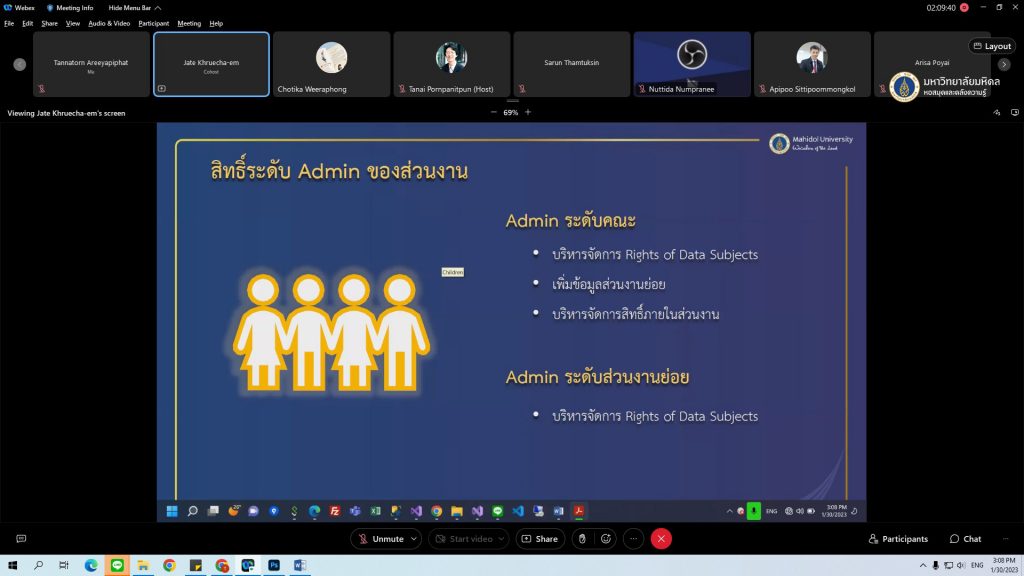 หอสมุดและคลังความรู้มหาวิทยาลัยมหิดล โดย ดร.อภิภู สิทธิภูมิมงคล รองผู้อำนวยการฝ่ายเทคโนโลยีการศึกษาและพันธกิจพิเศษ เป็นประธานกล่าวเปิดการอบรม การใช้ระบบกระบวนการขอใช้สิทธิของเจ้าของข้อมูลส่วนบุคคล (Data Subject Access Request Management) วิทยากรจาก กองเทคโนโลยีสารสนเทศ สำนักงานอธิการบดี มหาวิทยาลัยมหิดล โดยได้รับเกียรติจาก คุณตนัย พรพาณิชย์พันธุ์ นักวิเคราะห์นโยบายและแผน เป็นวิทยากรบรรยายในหัวข้อ “หลักการคุ้มครองข้อมูลส่วนบุคคลใน PDPA” และคุณสุรศักดิ์ ฤทธิ์ทอง หัวหน้างานวิเคราะห์ข้อมูลและบูรณาการระบบดิจิทัล และคุณเจตน์ เครือชะเอม นักวิชาการคอมพิวเตอร์ เป็นวิทยากรบรรยายในหัวข้อ สาธิตการใช้งานระบบ Data Subject Access Request (DSAR) เมื่อวันจันทร์ที่ 30 มกราคม 2566 ที่ผ่านมา ณ ห้อง The Platoon ชั้น 1 อาคารหอสมุดและคลังความรู้มหาวิทยาลัยมหิดล ศาลายา และผ่านระบบประชุมออนไลน์ Cisco WebEx Meeting โดยมีบุคลากรหอสมุดและคลังความรู้ฯ เข้าร่วมจำนวน 80 คน ซึ่งมีวัตถุประสงค์เพื่อเตรียมความพร้อมให้บุคลากรหอสมุดและคลังความรู้ฯ ได้เข้าใจระบบดังกล่าว นำไปสู่การใช้งานระบบและดำเนินงานด้านการคุ้มครองข้อมูลส่วนบุคคลอย่างมีประสิทธิภาพมากขึ้น