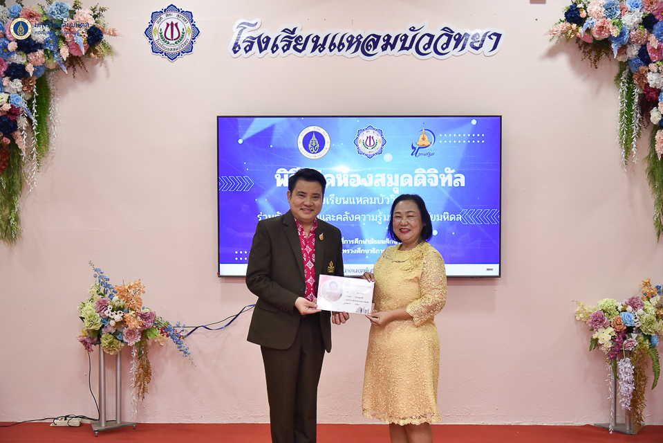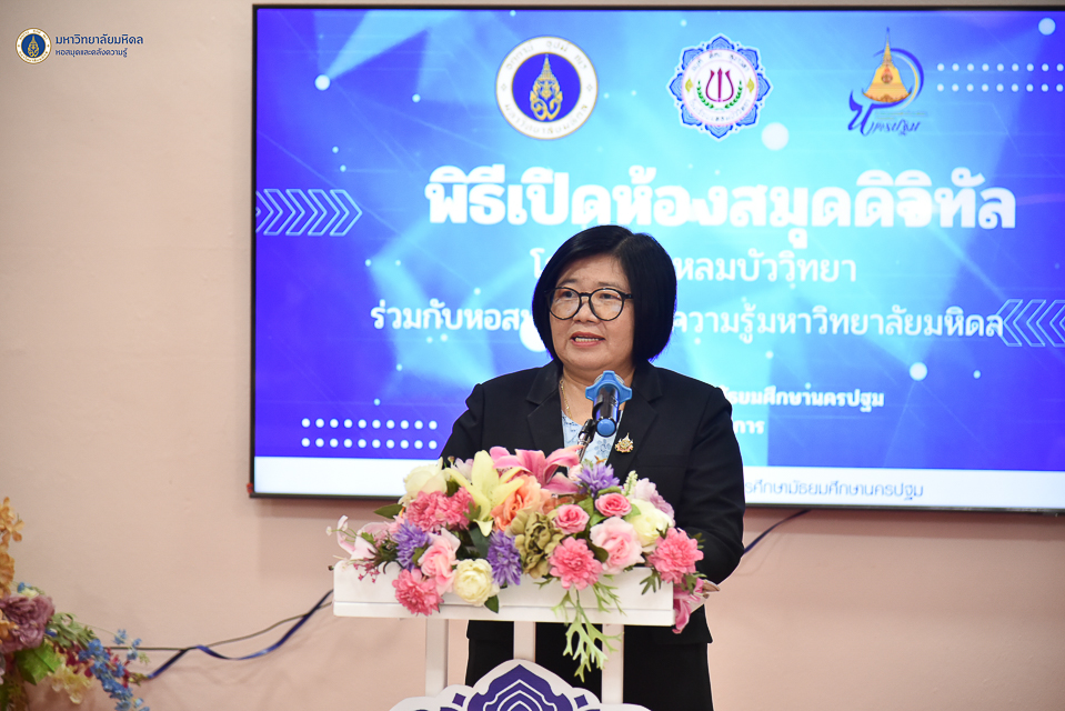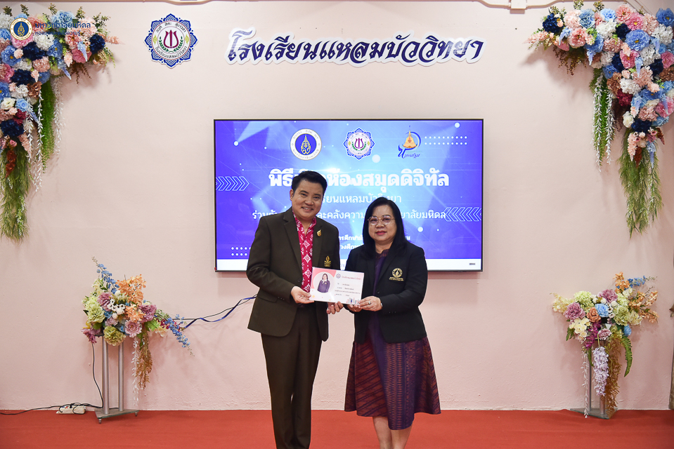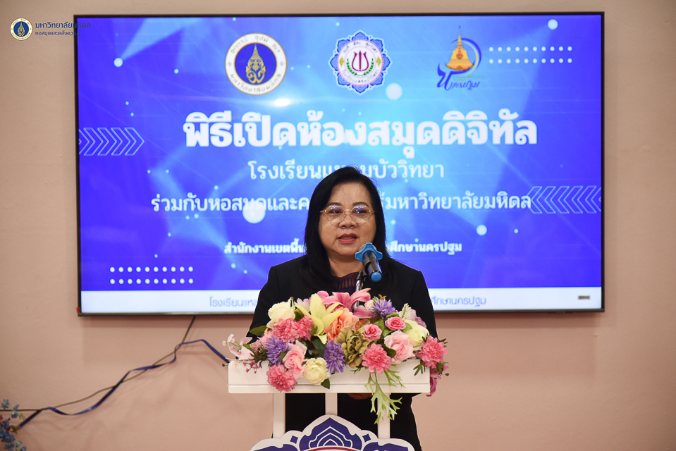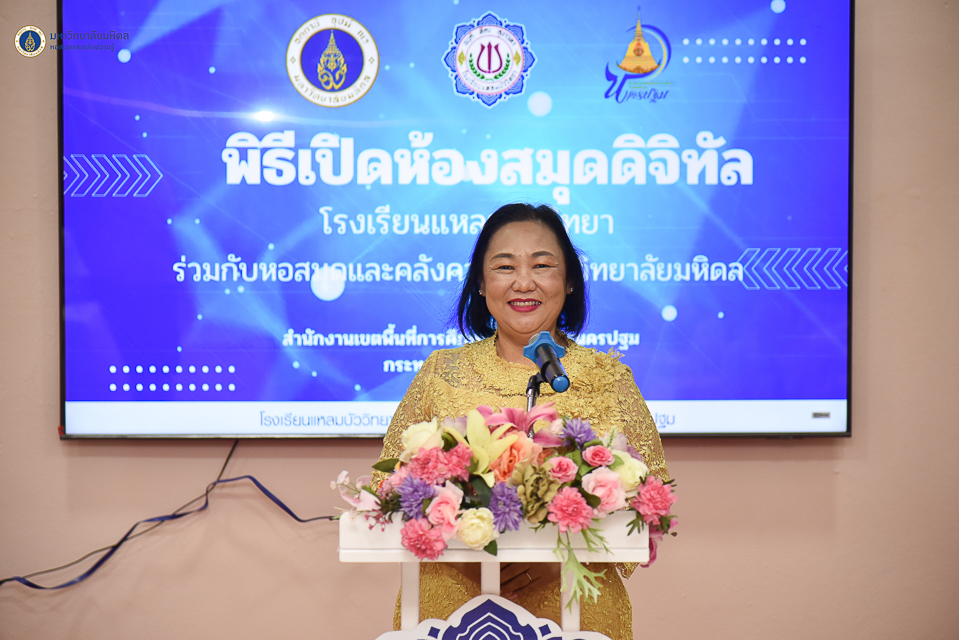 หอสมุดและคลังความรู้มหาวิทยาลัยมหิดล โดย คุณอังคณา อินทรพาณิชย์ รองผู้อำนวยการฝ่ายบริหารและพัฒนาคุณภาพ ร่วมเป็นสักขีพยานในพิธีเปิดห้องสมุดดิจิทัลของโรงเรียนแหลมบัววิทยา และกล่าวแสดงความชื่นชมกับโรงเรียนฯ ที่เล็งเห็นถึงความสำคัญของการส่งเสริมการเรียนรู้และการเข้าถึงสารสนเทศของนักเรียนด้วยเทคโนโลยีสมัยใหม่ เพื่อพัฒนาทักษะการแสวงหาความรู้อันเป็นประโยชน์ต่อการเรียนในระดับสูงขึ้นไป ตลอดจนสร้างทักษะการเรียนรู้ตลอดชีวิต โอกาสนี้ คุณกนกวรรณ การุณ รองผู้อำนวยการสำนักงานเขตพื้นที่การศึกษามัธยมศึกษานครปฐม ให้เกียรติเป็นประธานในพิธี พร้อมด้วย คุณภัครดา เทียนสมบัติ นักวิชาการศึกษาชำนาญการพิเศษ ผู้แทนจากศึกษาธิการจังหวัดนครปฐม ร่วมแสดงความยินดี โดยมี ดร.ธนกฤต ธรรมวณิชย์ ผู้อำนวยการโรงเรียนแหลมบัววิทยา กล่าวรายงานวัตถุประสงค์และมอบบัตรสมาชิกห้องสมุดกิตติมศักดิ์แด่ผู้สนับสนุนโครงการ และคณะกรรมการพันธกิจสัมพันธ์เพื่อสังคมของหอสมุดและคลังความรู้มหาวิทยาลัยมหิดล ในวันจันทร์ที่ 30 กันยายน พ.ศ. 2567 ณ โรงเรียนแหลมบัววิทยา