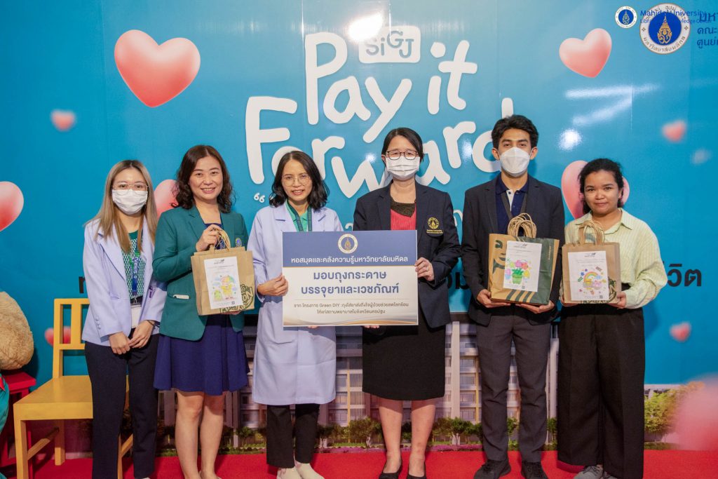 จำนวน 1,200 ใบ ให้กับ พญ.ศุภวรรณ ศิริวัฒนกุล รองผู้อำนวยการศูนย์การแพทย์กาญจนาภิเษก คณะแพทยศาสตร์ศิริราชพยาบาล มหาวิทยาลัยมหิดล โดยโครงการ Green DIY : ถุงใส่ยาส่งถึงใจผู้ป่วยช่วยลดโลกร้อน ให้แก่สถานพยาบาลในจังหวัดนครปฐม เป็นหนึ่งในโครงการพันธกิจสัมพันธ์เพื่อสังคมของหอสมุดและคลังความรู้ฯ เพื่อเสริมสร้างพันธกิจสัมพันธ์เพื่อสังคม ให้กับชุมชนโดยรอบมหาวิทยาลัยมหิดล ในวันพุธที่ 31 มกราคม 2567 ณ ศูนย์การแพทย์กาญจนาภิเษกฯ ซึ่งถุงกระดาษทั้งหมด เป็นการรับบริจาคจากประชาชนทั่วไป โดยได้รับความร่วมมือจากนักเรียน นักศึกษาที่เข้าร่วมในกิจกรรม Workshop ถุงใส่ยาส่งถึงใจผู้ป่วย และจากกิจกรรมไทยสร้างสรรค์ รวมใจกันรักษ์สิ่งแวดล้อม ณ โรงเรียนบ้านลำพยา ที่ผ่านมา