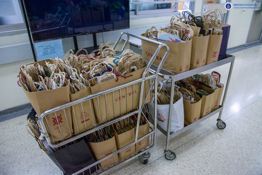 หอสมุดและคลังความรู้มหาวิทยาลัยมหิดล โดย คุณจีรนุช ธรณินทร์ เลขานุการหอสมุดและคลังความรู้ฯ เป็นผู้แทนหอสมุดและคลังความรู้ฯ มอบถุงกระดาษบรรจุยาและเวชภัณฑ์