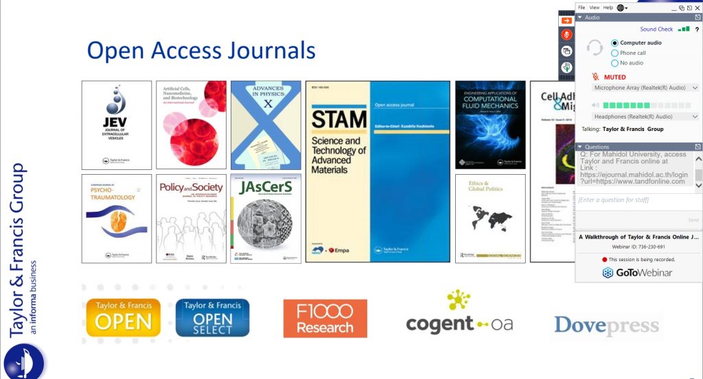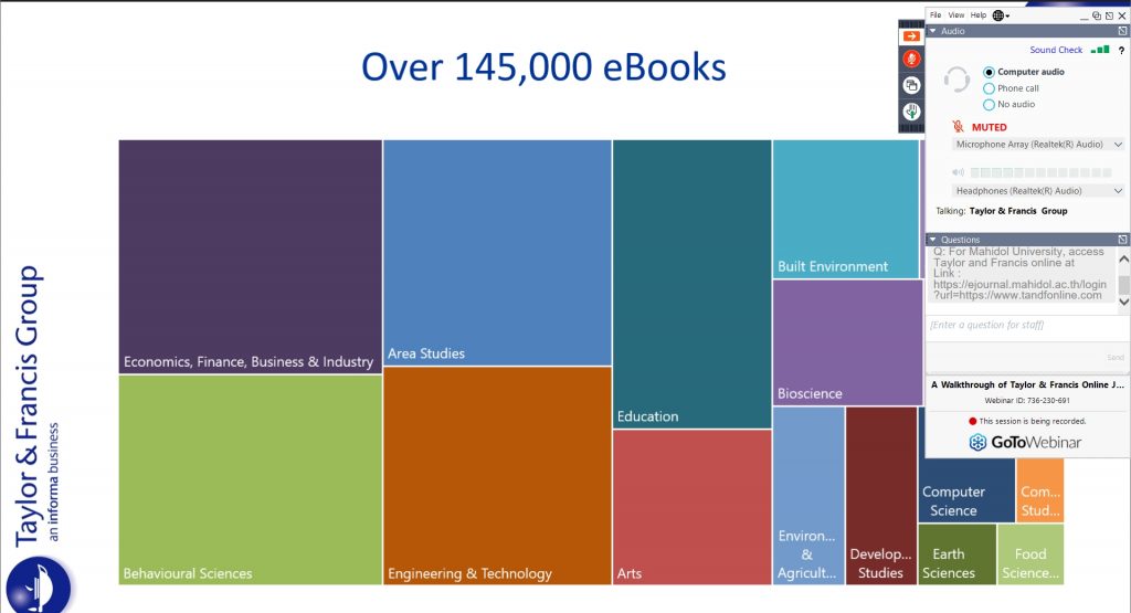 วันศุกร์ที่ 8 ตุลาคม 2564 เวลา 9.00-10.00 น. งานพัฒนาทรัพยากรวารสาร หอสมุดและคลังความรู้มหาวิทยาลัยมหิดล ได้จัดการอบรมเรื่อง การใช้งานฐานข้อมูล Taylor & Francis Online สำหรับอาจารย์ นักวิจัย นักศึกษา และบุคลากรมหาวิทยาลัยมหิดล ภายใต้โครงการจัดอบรมการเข้าใช้ฐานข้อมูลอิเล็กทรอนิกส์ Training for Users ประจำปีงบประมาณ 2564 โดยได้รับเกียรติจาก Ms. Quinie Lim ตำแหน่ง Senior Marketing Executive จากสำนักพิมพ์ Taylor and Francisเป็นวิทยากรบรรยายให้ความรู้