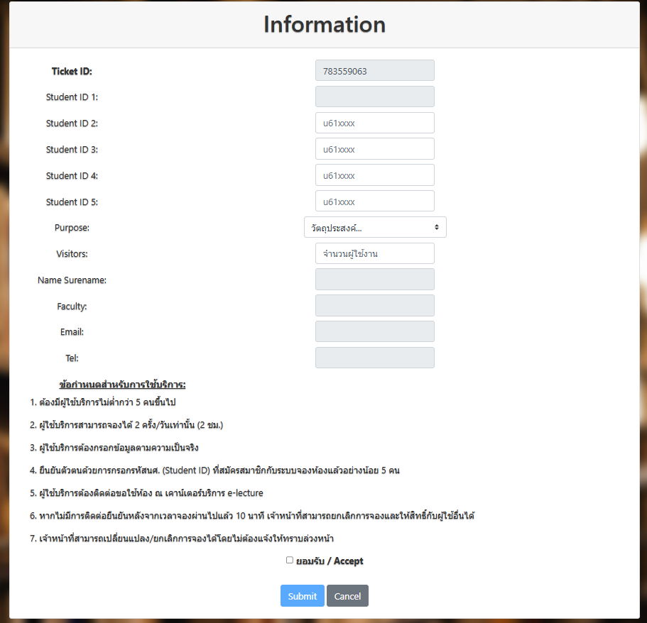 4. กรอกข้อมูลให้ครบถ้วน และทำเครื่องหมายเพื่อยอมรับข้อกำหนดสำหรับการใช้งาน ผู้ใช้บริการทุกท่านต้องมี accout ในระบบเพื่อที่จะสามารถจองห้องได้