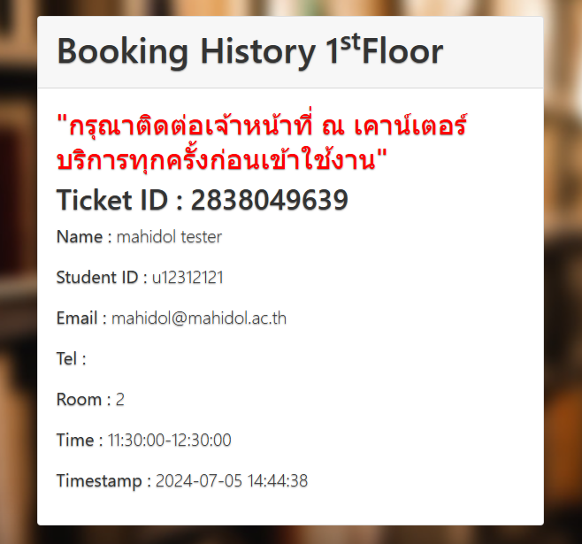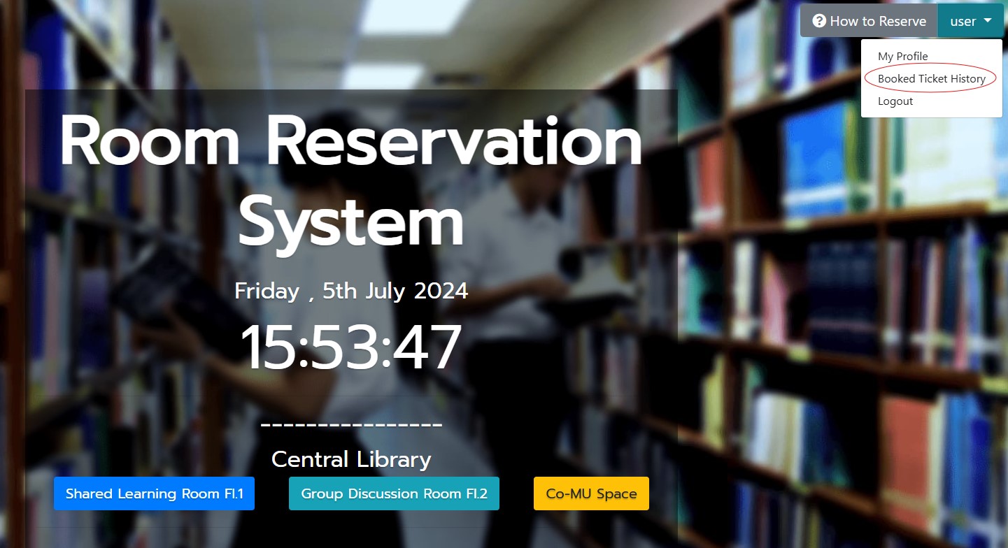 (When your reserved time is approaching, log in to the room booking system and show your Ticket ID by clicking the arrow at the top-right corner next to your username. Then select "Booked Ticket History" to view your Ticket ID, which is stored for up to one day.)