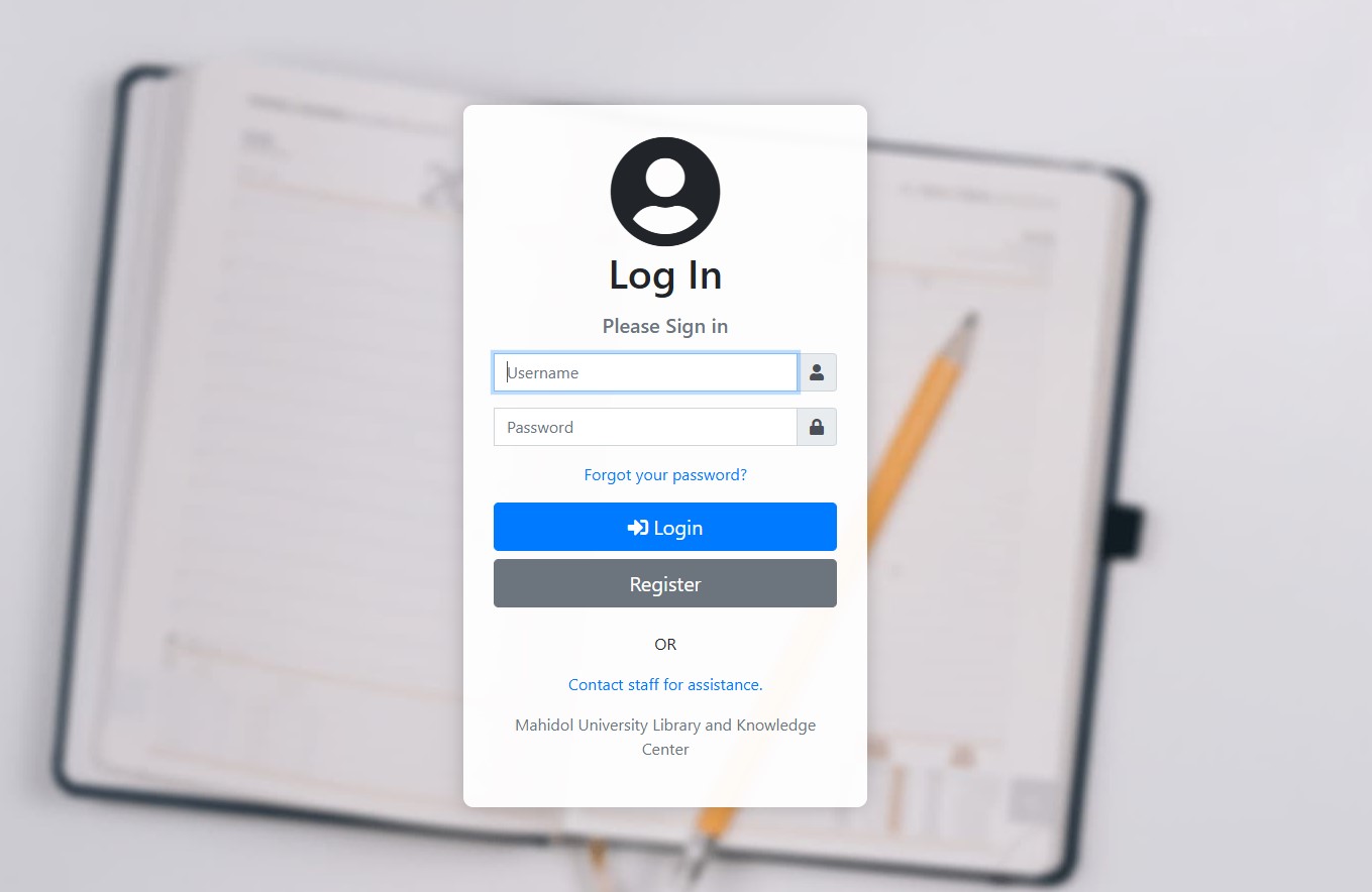 1. ผู้ใช้บริการต้อง Login เข้าระบบก่อนการใช้งานทุกครั้ง สำหรับการเข้าใช้งานระบบครั้งแรก ผู้ใช้บริการต้องลงทะเบียน โดยการคลิกที่ปุ่ม Register จากนั้นกรอกข้อมูลให้ครบถ้วน แล้วคลิกปุ่ม Register