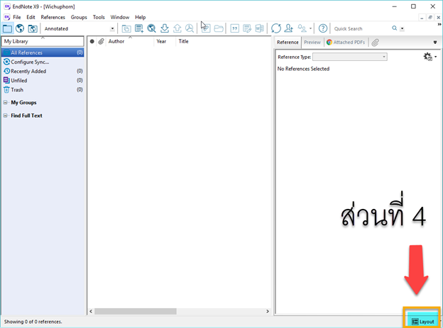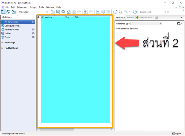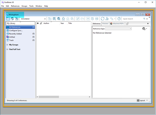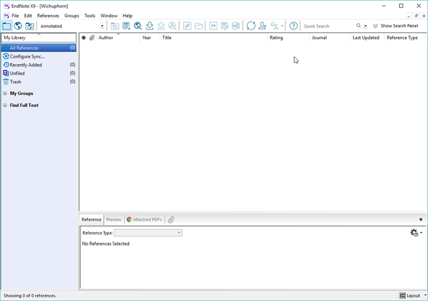 เปิดหน้า EndNote Library ที่เราสร้างไว้ขึ้นมา ไฟล์นามสกุล .enl จะพบกับหน้าจอตามภาพด้านล่าง