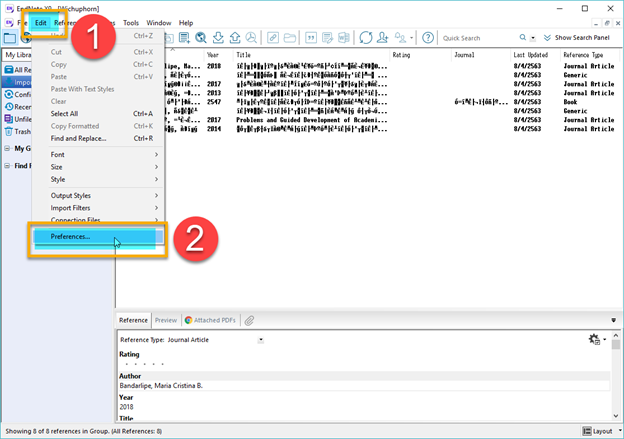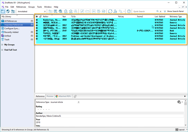 ดังนั้น หากผู้เขียนจำเป็นต้องอ้างอิงเอกสารที่มีภาษาไทยประกอบอยู่ด้วยนั้น ต้องตั้งค่าให้โปรแกรม EndNote สามารถอ่านและแสดงภาษาไทยได้ก่อน หลายคนไม่ได้ตั้งค่าในส่วนนี้ จึงทำให้เวลาที่ Import รายการอ้างอิงที่เป็นภาษาไทยเข้าสู่ตัวโปรแกรม EndNote กลายเป็นภาษาแปลกๆ ยกตัวอย่างตามภาพด้านล่าง