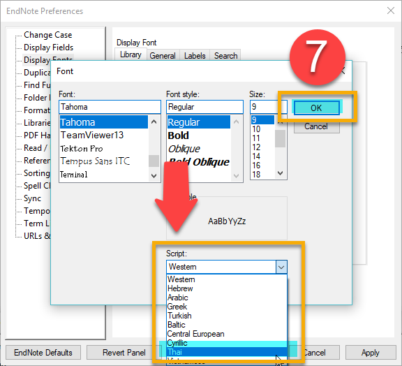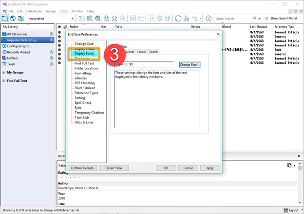 โดยส่วนใหญ่การเขียนวิทยานิพนธ์ งานวิจัย บทความ ฯลฯ จะมีทั้งภาษาอังกฤษ และภาษาไทย ตัวโปรแกรม EndNote จะตั้งค่า Default Font ไว้คือ Font :Segoe UI,9pt ซึ่งไม่สามารถแสดงภาษาไทยได้